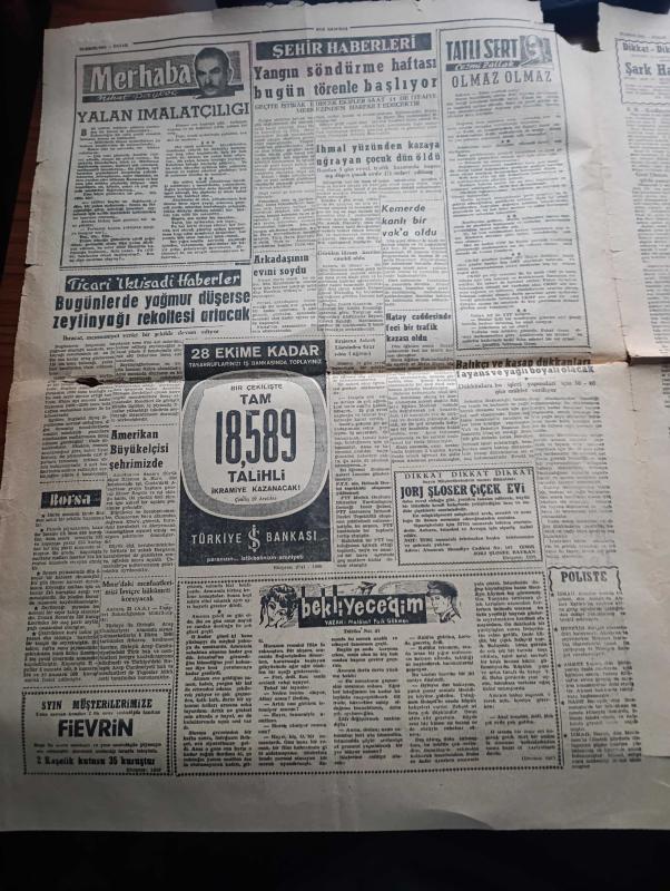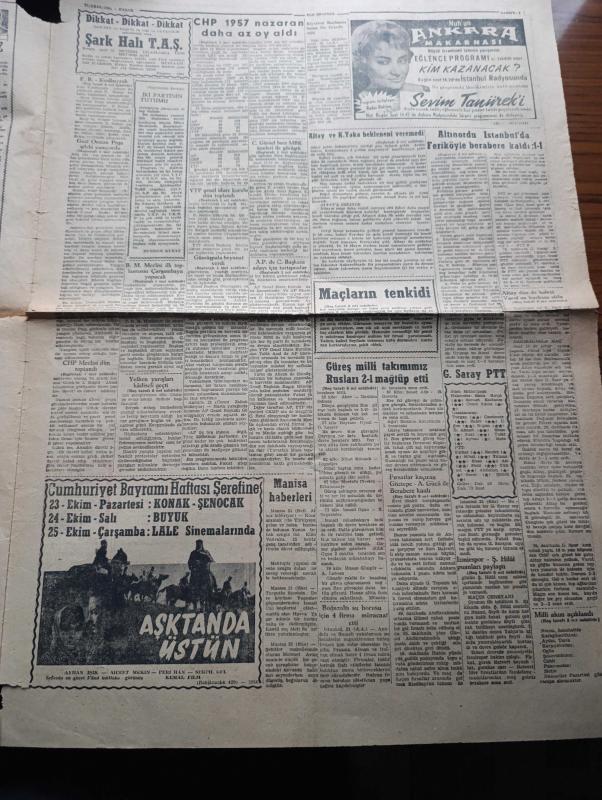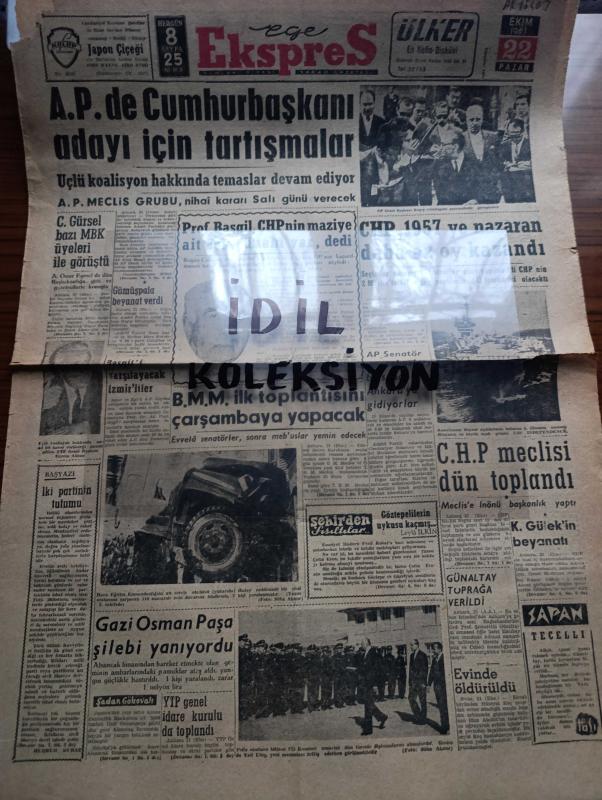 Ege Ekspres Gazetesi - 22 Ekim 1962 - Turkish Newspaper - Adalet Partisinde cumhurbaşkanı adayı için tartışmalar - Cemal Gürsel bazı milli birlik komitesi üyeleri ile görüştü - profesör Ali Fuat Başgil CHP'nin maziye ait çok günahı var dedi - Adalet Partisi Başkanı Ragıp Gümüşpala gazetecilerle görüşürken Fotoğrafı - CHP 1957'ye nazaran daha az oy kazandı - Büyük Millet Meclisi ilk toplantısını çarşamba yapacak - Kasım Gülek'in beyanatı - eski başbakanlardan Şemsettin Günaltay toprağa verildi - bekleyeceğim yazan Melahat Faik Gökmen - balıkçı ve kasap dükkanları fayans ve yağlı boyalı olacak - Nuh'un Ankara makarnası eğlence programında Sevim Tanürek - Cumhuriyet Bayramı haftası şerefine aşktan da üstün filmi başrollerde Ayhan Işık Ahmet Mekin Peri Han Konak Şenocak sinemalarında - 5 İzmir takımı dün 4 puan alabildi - Spor Toto neticeleri - fırsatlar kaçıran Göztepe Ankaragücü ile yenişemedi - Fenerbahçe Kızılbayrak oynuyor - Yelken yarışları hadiseli geçti - Galatasaray 2 PTT 0, Nihat Kürşad tarafından kaleme alınmıştır. Ege Ekspres Gazetesi - 22 Ekim 1962 - Turkish Newspaper - Adalet Partisinde cumhurbaşkanı adayı için tartışmalar - Cemal Gürsel bazı milli birlik komitesi üyeleri ile görüştü - profesör Ali Fuat Başgil CHP'nin maziye ait çok günahı var dedi - Adalet Partisi Başkanı Ragıp Gümüşpala gazetecilerle görüşürken Fotoğrafı - CHP 1957'ye nazaran daha az oy kazandı - Büyük Millet Meclisi ilk toplantısını çarşamba yapacak - Kasım Gülek'in beyanatı - eski başbakanlardan Şemsettin Günaltay toprağa verildi - bekleyeceğim yazan Melahat Faik Gökmen - balıkçı ve kasap dükkanları fayans ve yağlı boyalı olacak - Nuh'un Ankara makarnası eğlence programında Sevim Tanürek - Cumhuriyet Bayramı haftası şerefine aşktan da üstün filmi başrollerde Ayhan Işık Ahmet Mekin Peri Han Konak Şenocak sinemalarında - 5 İzmir takımı dün 4 puan alabildi - Spor Toto neticeleri - fırsatlar kaçıran Göztepe Ankaragücü ile yenişemedi - Fenerbahçe Kızılbayrak oynuyor - Yelken yarışları hadiseli geçti - Galatasaray 2 PTT 0 adlı eser Türkçe dilindedir.