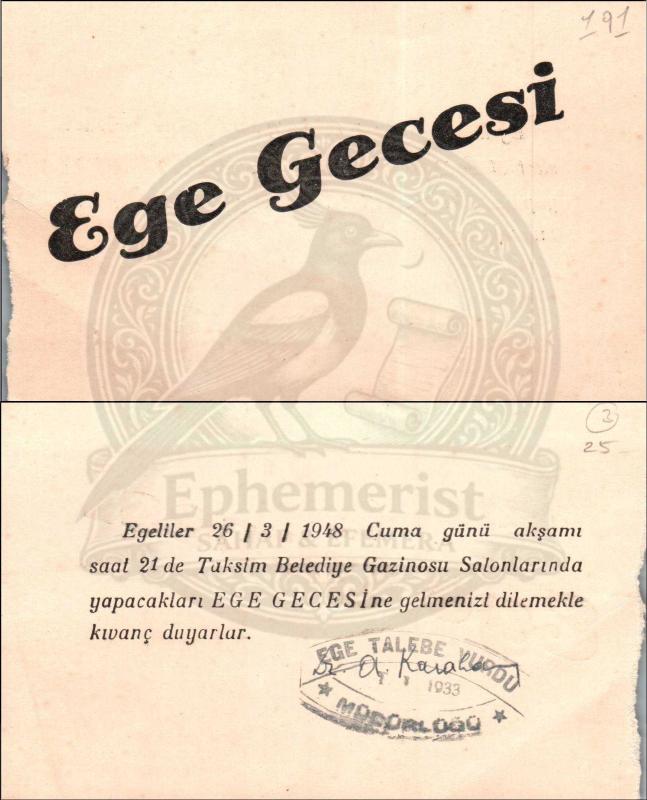 Ege Gecesi davetiyesi. Taksim Belediye Gazinosu, 1948. (Orijinal Belge, S/B, 1948, 9x14 cm.), en son bir ay önce güncellenmiştir.