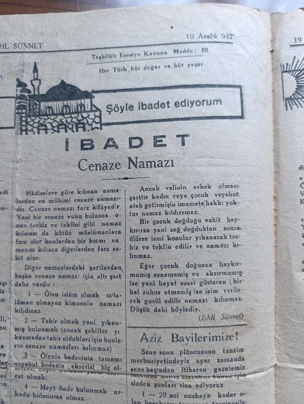 Ehli Sünnet Gazetesi - Turkish Newspaper - 19 Aralık 1947 - din ve laiklik - Bend şiiri yazan Nesimioğlu Hulusi Bitlis Aktürk - fitneye lüzum yoktur - Hz Muaviye ashabı Resulullah'tandır - İslamiyet dini dört ana prensibi ortaya atmıştır itikat ibadet ahlak muamelat - şöyle iman ediyorum - Batıniye Mezhebi - ibadet cenaze namazı - teşkilat-ı esasiye kanunu madde 75 hiç kimse felsefi inancından din ve mezhebinden dolayı kınanamaz - Teşkilatı esasiye kanunu madde 68 her Türk hür doğar ve hür Yaşar - cenaze namazı için 6 şart - komiteye girenlerin 7 derecesi vardır imam hüccet zümüdda ebvab daimi mezun mükellib mümin - münevverlerle İslam tarihi - ben neyim - İlyas ve Elyesa Aleyhisselam - Zekeriya Yahya Aleyhisselam - Muaviye fevkalade akil ve zekavete fesahat ve belagata ve kuvveti natıkaya malik gayetle sabur ve halim ve Kerem ve savahetle muttasıf bir zattır - buhari Şerif kitabının 4. Cüzü 184. Peygamber efendimiz ne buyuruyor - biraz da Neşe inat ettik fakat - Harun Reşit hazreti adlı eser, Kitap > Süreli Yayınlar > Gazeteler > Türkiye > Genel > Günlük kategorisinde İkinci El olarak satıştadır.