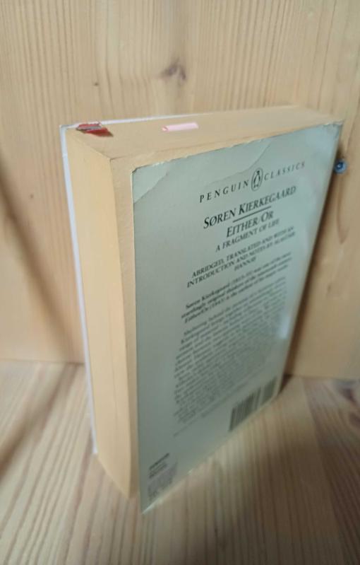 Either / Or: A Fragment of Life, Soren Kierkegaard tarafından kaleme alınmıştır. Eser Victor Eremita editörlüğünde hazırlanmıştır. Kitap 1992 yılında Penguin Books tarafından [LondON] yayınlanmıştır. Bu baskının çevirisi Alastair Hannay tarafından yapılmıştır. 640 sayfadır. Either / Or: A Fragment of Life adlı eser İngilizce dilindedir.