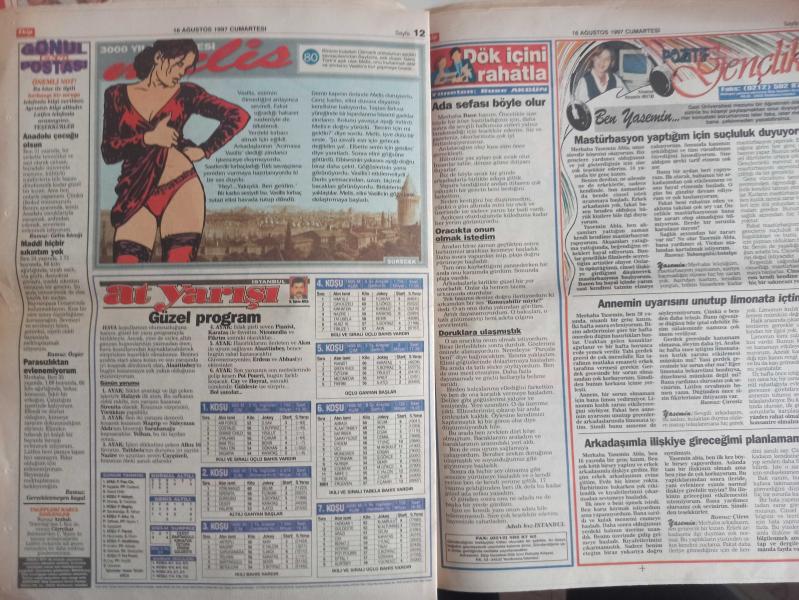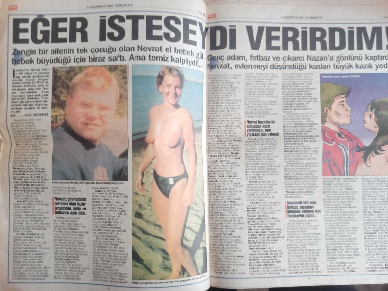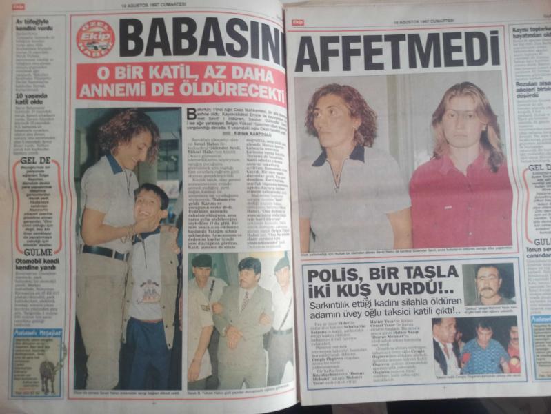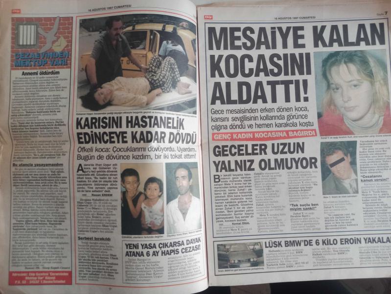 Ekip Haftalık Aktüalite Sinema Tiyatro Müzik ve Magazin Gazetesi - 16 Ağustos 1997 - Şükür Bakireyim - Sekreterine Fahişe Diyen Karısını Bıçakladı - Adalet Durma - Babasını Affetmedi - O Bir Katil, Az Daha Annemi de Öldürecekti - Seval Hacı - Polis, Bir Taşla İki Kuş Vurdu! - Mehmet Yazar - Cengiz Özgören - Karısını Hastaneleik Edinceye Kadar Dövdü - Mesaiye Kalan Kocasını Aldattı! - Aydın Gürsel - Gürüz Tüzin - Mesleğim İçin Soyunurum - Sanem Çelik - Ece Uslu - Polis 2000 Çizgi Romanı - Dök İçini Rahatla - Pozitif Gençlik - Yeniden Doğdum Fotoromanı - Çok Ayıp Etti - Dansöz Papatya - O Alemin İnsanları - Özkan Taşdelen - Yazık Oldu fotoğraf ve haberi - Tam Takım Dergi Yıpranma, sararmalar, kupon kesiği ve yırtılmalar zamana bağlı olarak görülebilir