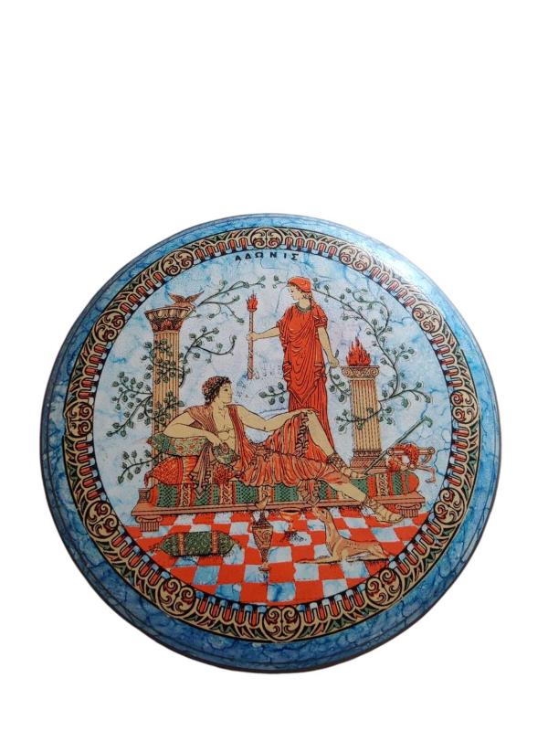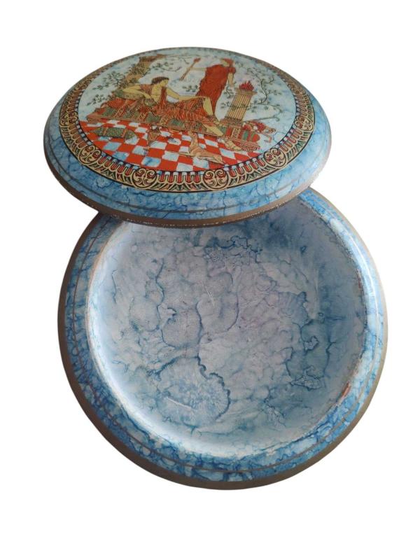 11 cm çapında, 3.5 cm uzunluğunda el boyama Yunanistan Mitolojik Figürlü Kutu.