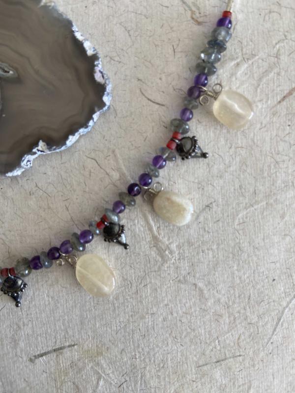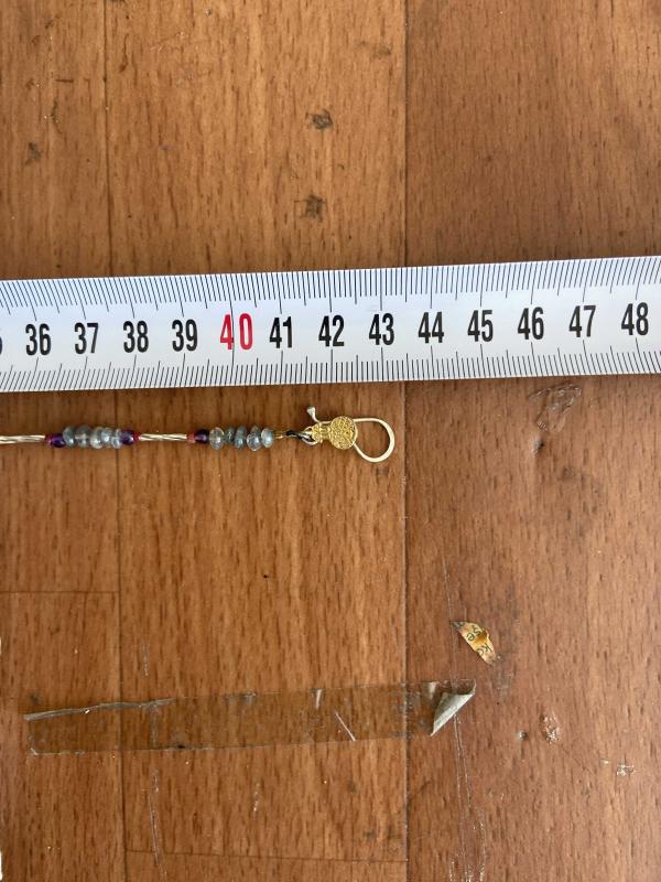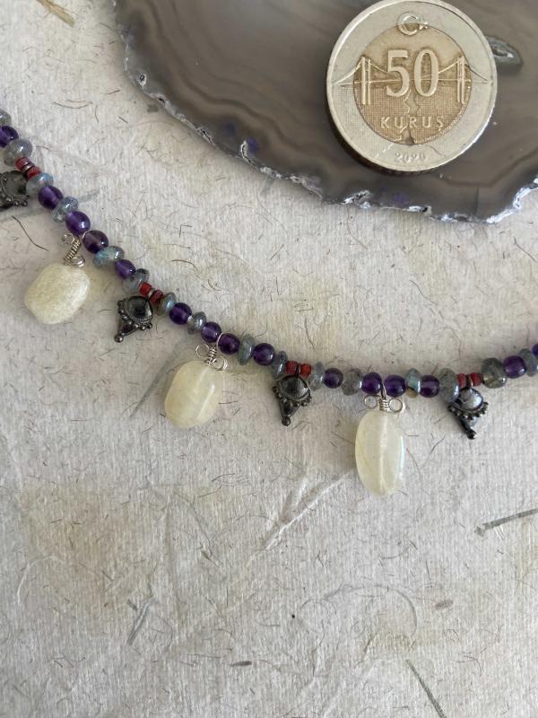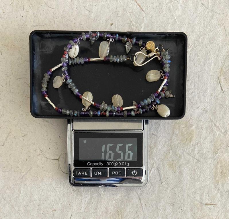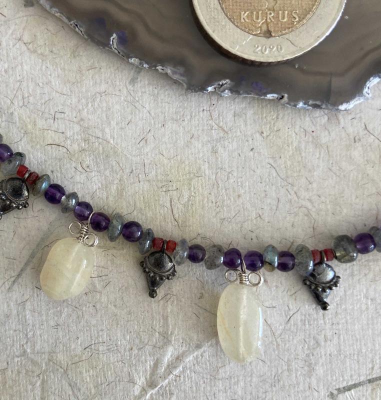 El İşçiliği Özel tasım Gümüş, Doğal Taş Kolye **** ERK Tasım imalatı **** * Kolye Ametist, Labradorid, Beyaz Akik (Kalsedon) ve oksitlenmiş gümüş parçalardan oluşmaktadır, * Çelik ipe dizilmiştir kopma yapmaz. * Metal kısımları 925 ayar gümüştür. * Toplam uzunluğu 43cm ön bölüm 18 cm ve 16,56gr. dir. * Özel tasarımdır. Şimdiden güle güle kullanın.