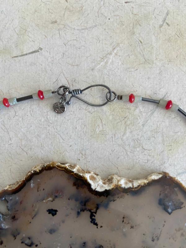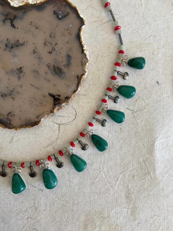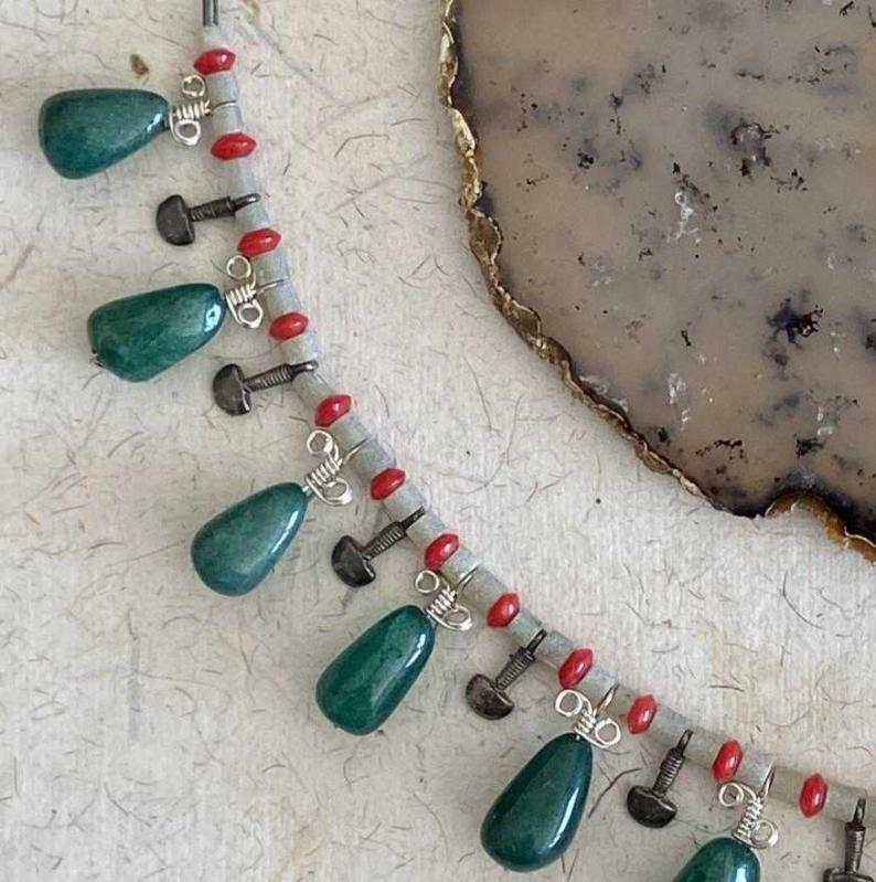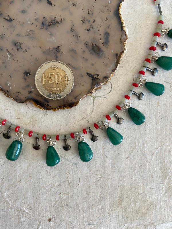 El İşçiliği Özel tasım Gümüş, Doğal Taş Kolye **** ERK Tasım imalatı **** * Kolye Yeşim (Ceyt),Mercan ve oksitlenmiş gümüş parçalardan oluşmaktadır, * Çelik ipe dizilmiştir kopma yapmaz. * Metal kısımları 925 ayar gümüştür. * Toplam uzunluğu 43cm ön bölüm (sallantılı kısım) 21cm ve 26.82gr. dir. * Özel tasarımdır. Şimdiden güle güle kullanın.