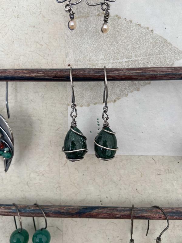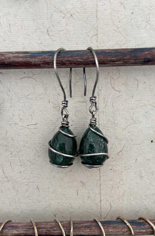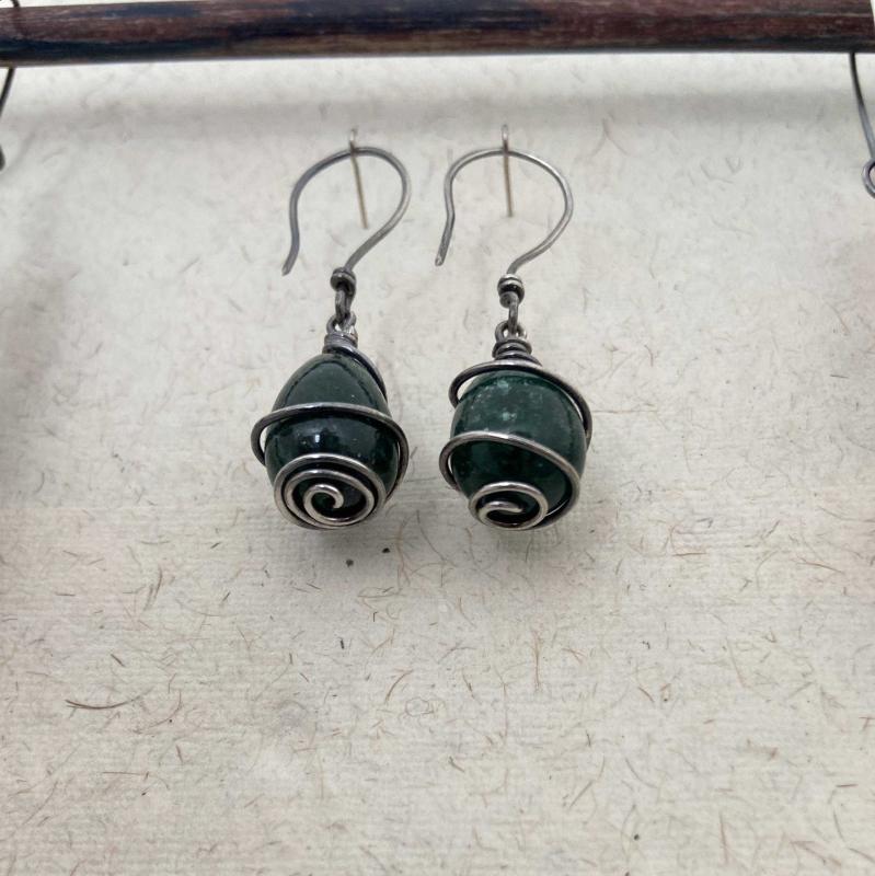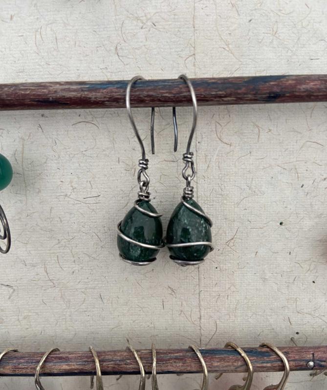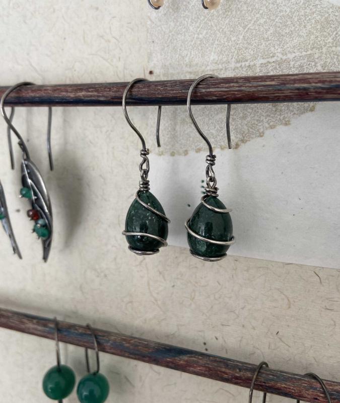 El işçiliği Gümüş, Yeşim Taşlı Küpe * Metal kısımları 925 ayar gümüş telden yapılmıştır. 7.40gr * El işçiliği, kendi tasarımım ve imalatım. * Gümüş kısımları kısmen oksitlidir. * Fotoğraflardaki ürün gönderilecektir. * Zevkle kullanacağınız özel tasarım ürün.