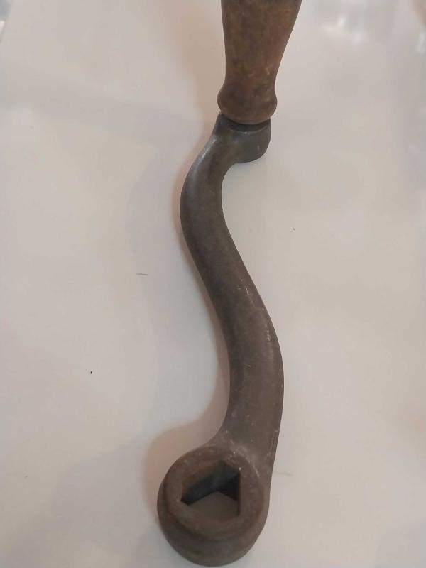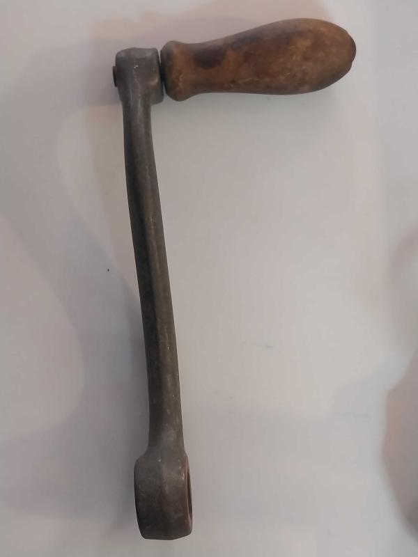 El Krankı, Bu görseldeki nesne, eski dikiş makineleri, fonograflar veya diğer mekanik cihazlar için kullanılan antik bir el krankıdır. Malzeme: Genellikle dökme demir veya metalden üretilmiş sağlam bir gövdeye sahiptir. Özellik: Döner bir ahşap veya plastik tutamağı bulunur. İşlev: Döndürme hareketini mekanik enerjiye çevirerek makineyi manuel olarak çalıştırmak için kullanılır. Kullanım Alanı: Vintage dikiş makineleri, müzik kutuları veya eski el aletleri için yedek parça veya koleksiyon objesi olarak değerlidir. başlıklı antika/koleksiyon objesi Osmanlı menşe’lidir. 1900-1949 arası dönemine aittir.