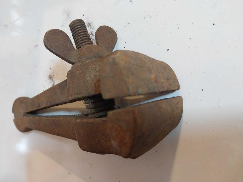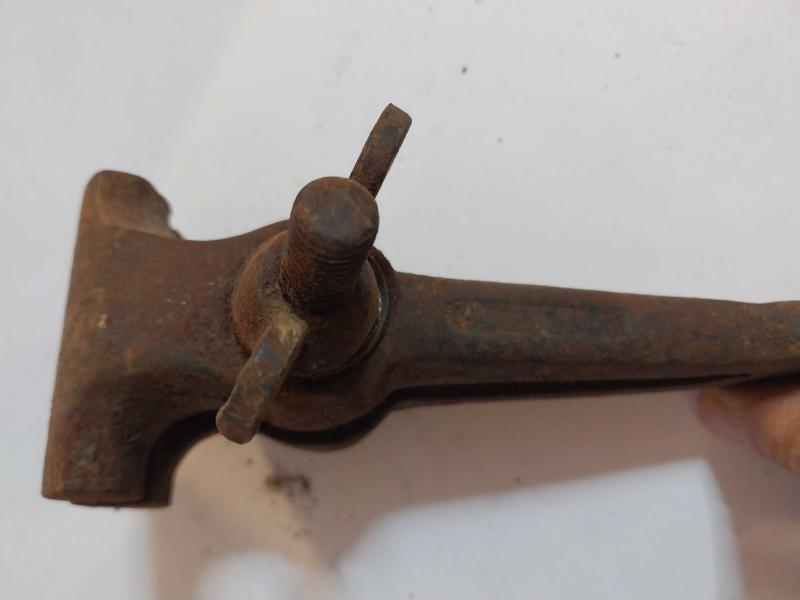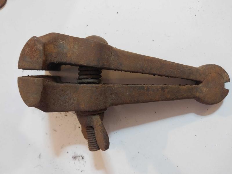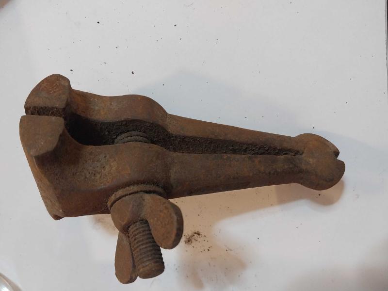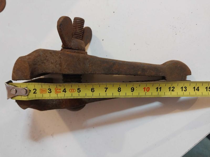 El Mengenesi. Osmanlı dönemine ait el yapımı bir el mengenesi (hand vice) koleksiyon parçasıdır. Tarihi Değer: Genellikle dövme demirden üretilen bu tür aletler, antika ve koleksiyon değeri taşır. Kullanım Alanı: Küçük parçaları tutmak, sıkıştırmak veya zımparalama/eğeleme işlemleri sırasında sabit tutmak için kullanılırdı. Özellikleri: Görseldeki örnekte, parçayı sabitlemek için kullanılan klasik bir vida mekanizması ve yay bulunmaktadır. Kullanım Amaçları: Takı yapımı, saat tamiri veya küçük metal parçaların işlenmesi gibi hassas işlerde yaygındı. başlıklı antika/koleksiyon objesi Osmanlı menşe’lidir. 1920-1940 arası dönemine aittir.