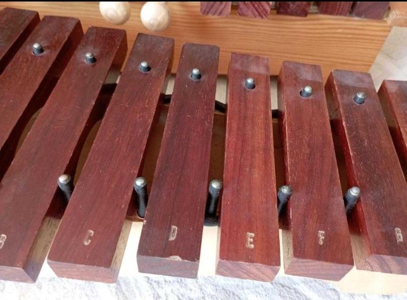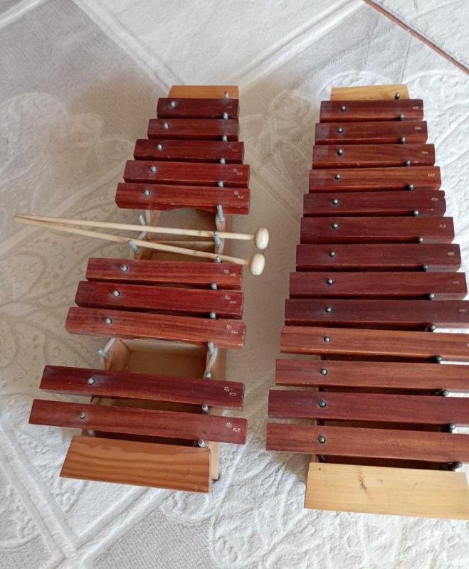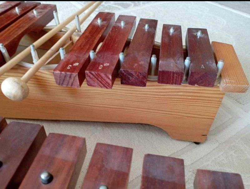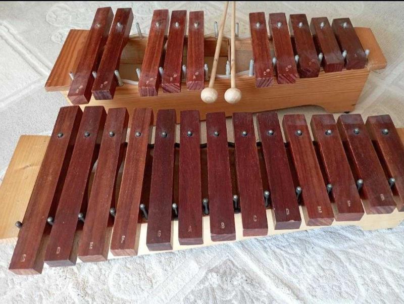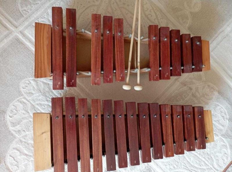 Ahşap ksilofon. İki parçalı. Hiç kullanılmamıştır. Boy 60 cm, geniş en 26 cm, daren 10 cm, yükseklik 15cm. El yapımı olduğunu söylemişti satın aldığım müzik evi sahibi.