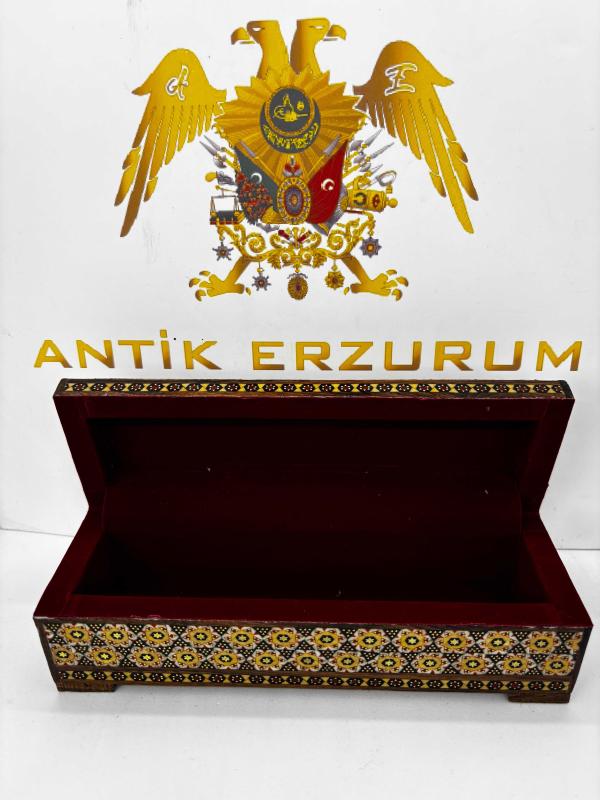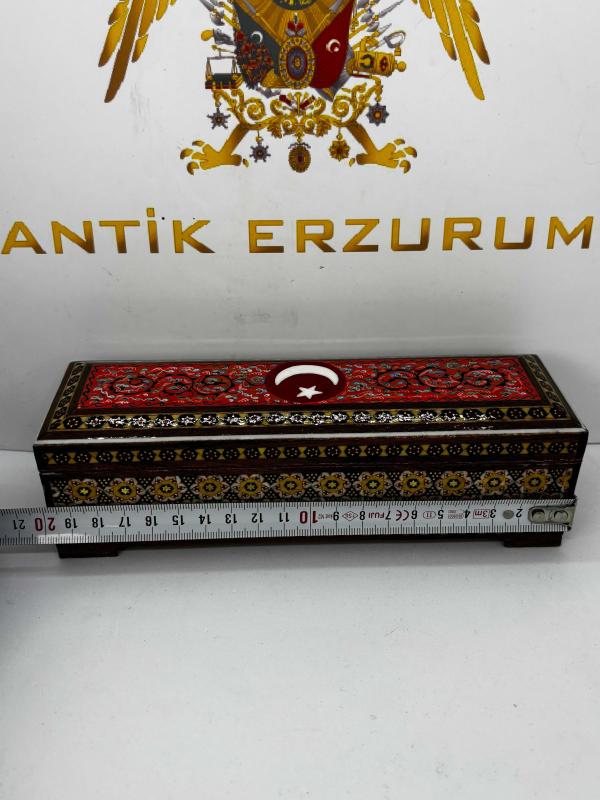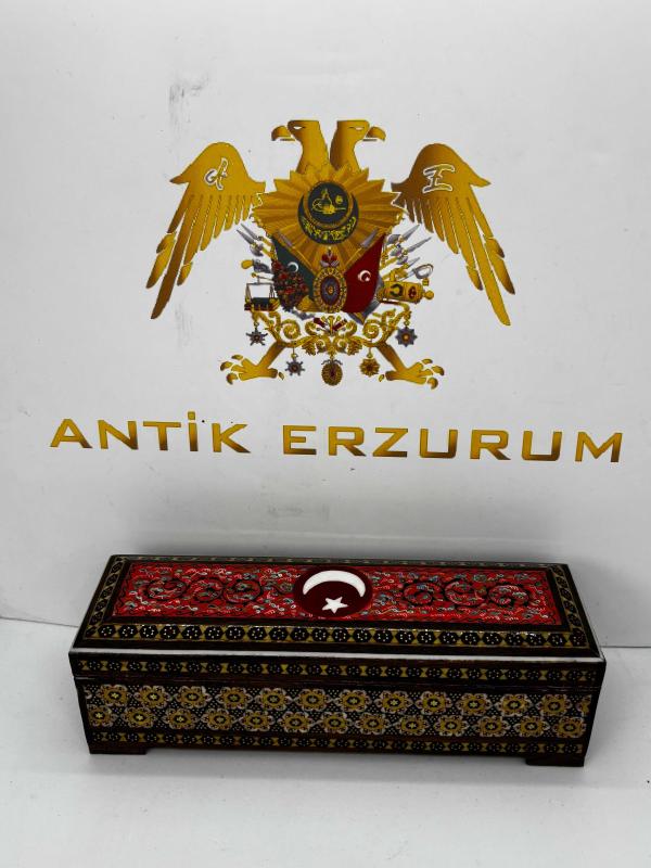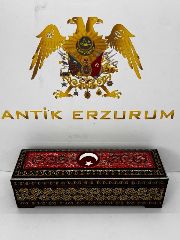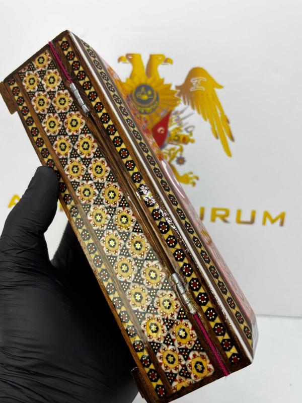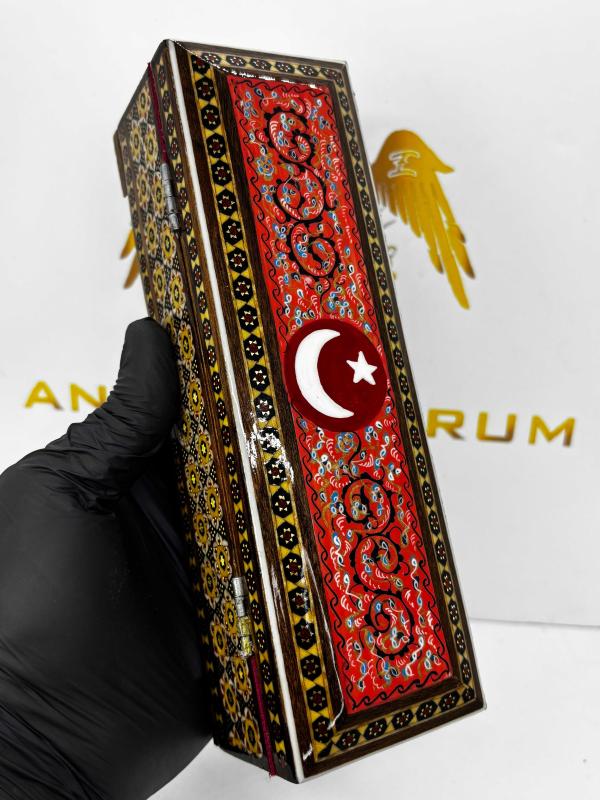 Doğu’nun Zarafeti, Ay-Yıldız’ın Gururuyla Buluştu: El Yapımı Hatem Sanatı Mücevher Kutusu Geleneksel Orta Doğu sanatının zirvesi kabul edilen Hatem (Khatamkari) işçiliği, Türkiye’ye özel bu eşsiz tasarımda hayat buluyor. Binlerce yıllık bir geleneğin mirasını taşıyan bu kutu, sadece bir saklama alanı değil, masanızın üzerinde ışıldayacak bir sanat eseridir. ✨ Öne Çıkan Özellikler: • Kusursuz Hatem İşçiliği: Ahşap, kemik ve metal (pirinç) tellerin mikroskobik hassasiyetle bir araya getirilmesiyle oluşturulan geometrik desenler, her santimetresinde yoğun bir el emeği barındırır. • Ay-Yıldız Temalı Özel Tasarım: Kutunun üst yüzeyinde yer alan kırmızı zemin üzerine işlenmiş zarif Ay-Yıldız figürü ve geleneksel motifler, bu eseri Türkiye’deki koleksiyonerler için paha biçilemez kılıyor. • Zengin Detaylar: Parlak lake kaplaması sayesinde desenlerin derinliği korunurken, iç kısmındaki kadife doku değerli takılarınızı ve hatıralarınızı en güvenli şekilde muhafaza eder. • Boyutlar: Yaklaşık 20 cm uzunluk, 6 cm genişlik ve 5.5 cm yükseklik ölçüleriyle hem gösterişli hem de ergonomik bir yapıdadır. 🛡️ Neden Bu Eser? Bu kutu, sıradan bir fabrikasyon ürün değildir. Sabrın ve ustalığın birleşimi olan Hatem sanatı, her bir parçanın kendine has bir ruhu olmasını sağlar. İster sevdiklerinize ömürlük bir hediye, ister evinizin en özel köşesine kültürel bir dokunuş olarak tercih edin; bu eser nesiller boyu aktarılacak bir mirastır. Geçmişin estetiğini, bugünün asaletiyle keşfedin.