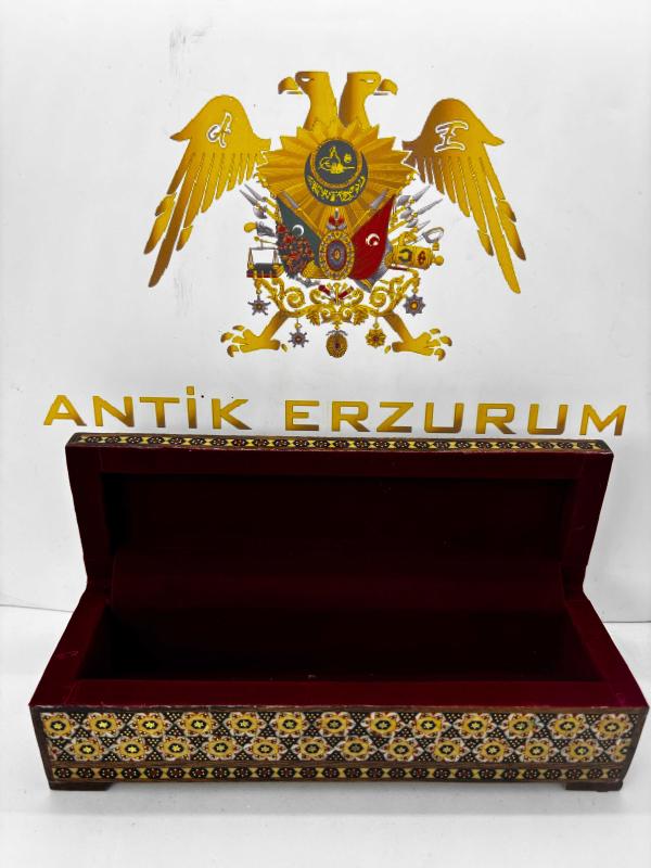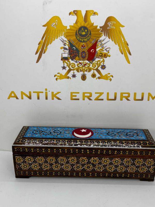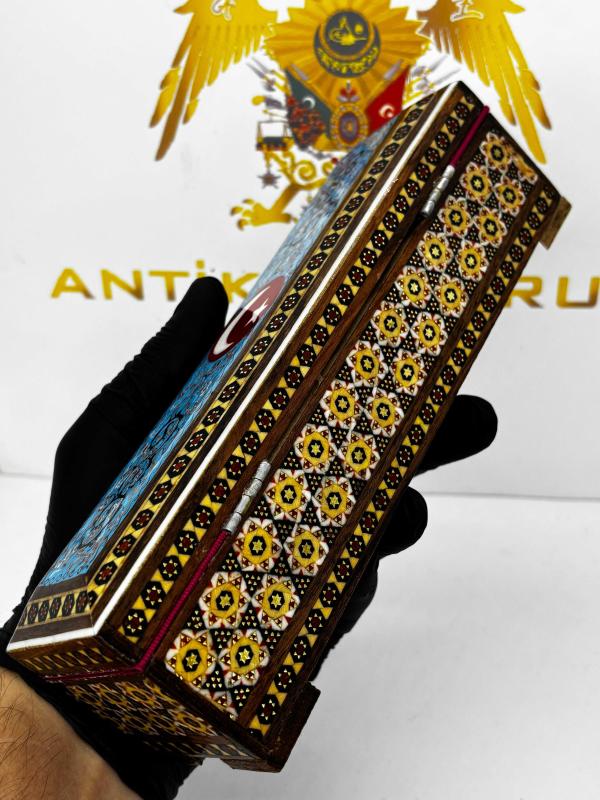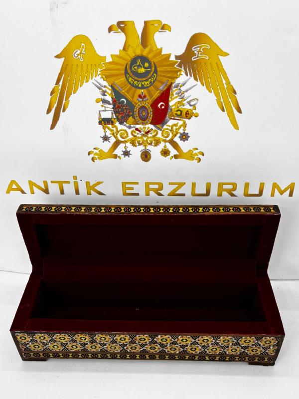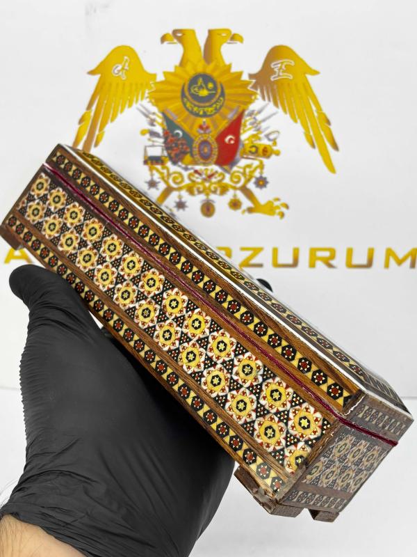 Doğu’nun Zarafeti, Ay-Yıldız’ın Gururuyla Buluştu: El Yapımı Hatem Sanatı Mücevher Kutusu Geleneksel Orta Doğu sanatının zirvesi kabul edilen Hatem (Khatamkari) işçiliği, Türkiye’ye özel bu eşsiz tasarımda hayat buluyor. Binlerce yıllık bir geleneğin mirasını taşıyan bu kutu, sadece bir saklama alanı değil, masanızın üzerinde ışıldayacak bir sanat eseridir. ✨ Öne Çıkan Özellikler: • Kusursuz Hatem İşçiliği: Ahşap, kemik ve metal (pirinç) tellerin mikroskobik hassasiyetle bir araya getirilmesiyle oluşturulan geometrik desenler, her santimetresinde yoğun bir el emeği barındırır. • Ay-Yıldız Temalı Özel Tasarım: Kutunun üst yüzeyinde yer alan kırmızı zemin üzerine işlenmiş zarif Ay-Yıldız figürü ve geleneksel motifler, bu eseri Türkiye’deki koleksiyonerler için paha biçilemez kılıyor. • Zengin Detaylar: Parlak lake kaplaması sayesinde desenlerin derinliği korunurken, iç kısmındaki kadife doku değerli takılarınızı ve hatıralarınızı en güvenli şekilde muhafaza eder. • Boyutlar: Yaklaşık 20 cm uzunluk, 6 cm genişlik ve 5.5 cm yükseklik ölçüleriyle hem gösterişli hem de ergonomik bir yapıdadır. 🛡️ Neden Bu Eser? Bu kutu, sıradan bir fabrikasyon ürün değildir. Sabrın ve ustalığın birleşimi olan Hatem sanatı, her bir parçanın kendine has bir ruhu olmasını sağlar. İster sevdiklerinize ömürlük bir hediye, ister evinizin en özel köşesine kültürel bir dokunuş olarak tercih edin; bu eser nesiller boyu aktarılacak bir mirastır. Geçmişin estetiğini, bugünün asaletiyle keşfedin.