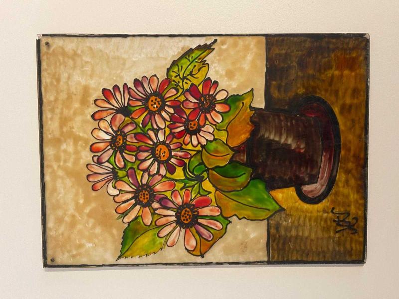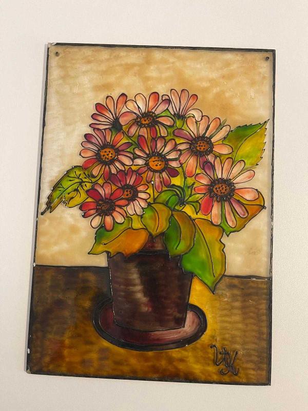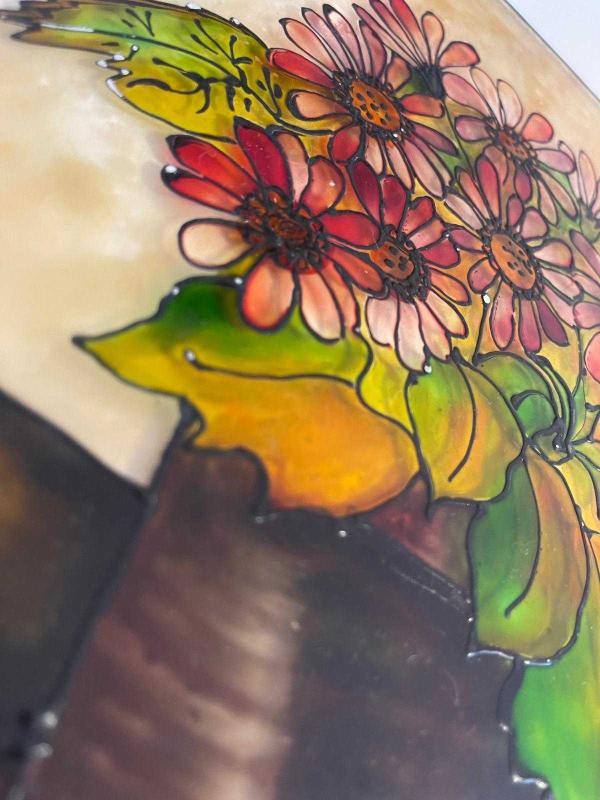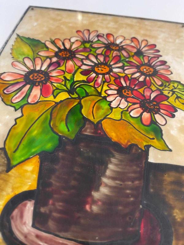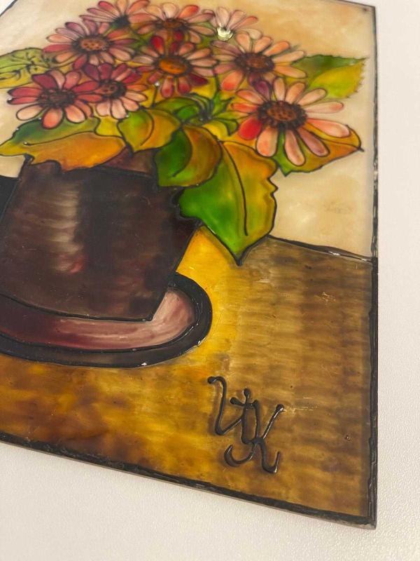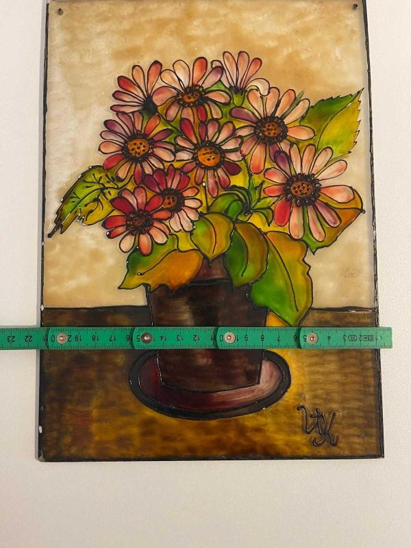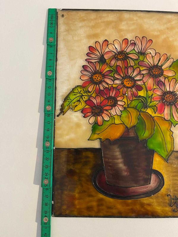 Canlı renklerde, vazo içinde demet çiçekleri tasvir eden el yapımı tablo. Duvar dekorasyonu için uygundur. Milas üzerine boyanmıştır. Çerçevesizdir. Asma yerleri mevcuttur. Çok eski üründür. #antika #retro #vintage #elboyama #vitray #camboyama #antikavitray 2502644