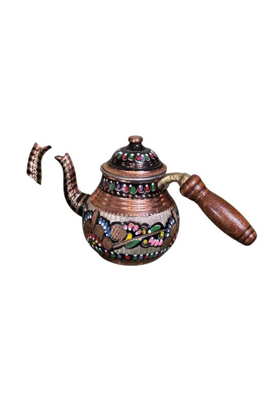 El işlemesi bakır çaydanlık takımı büyük 15 küçük 13 cm boyunda başlıklı antika/koleksiyon objesinin menşei belirtilmemiştir. Objenin ait olduğu dönem bilinmeketedir.