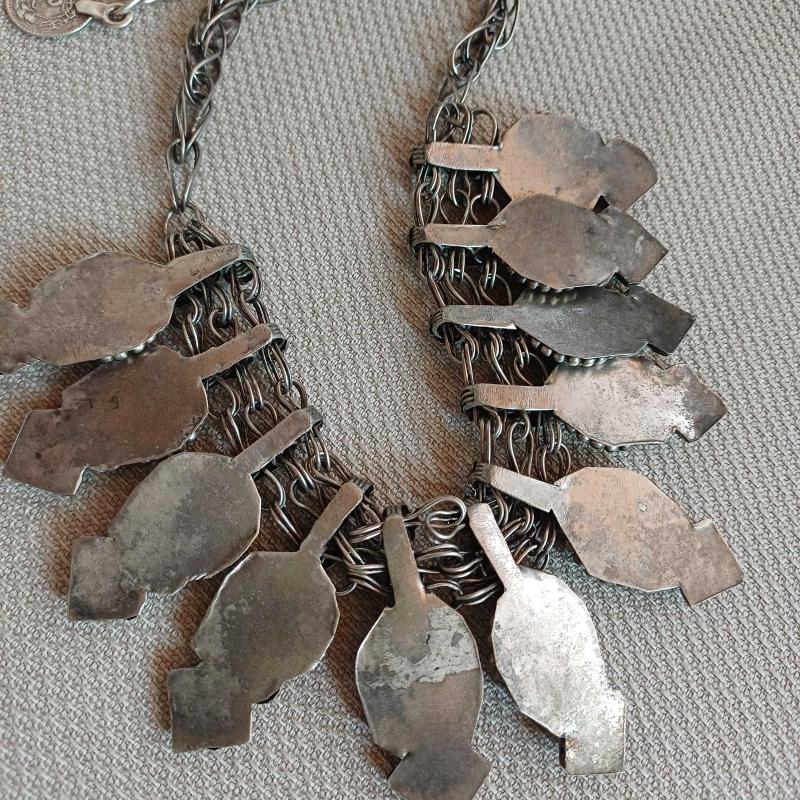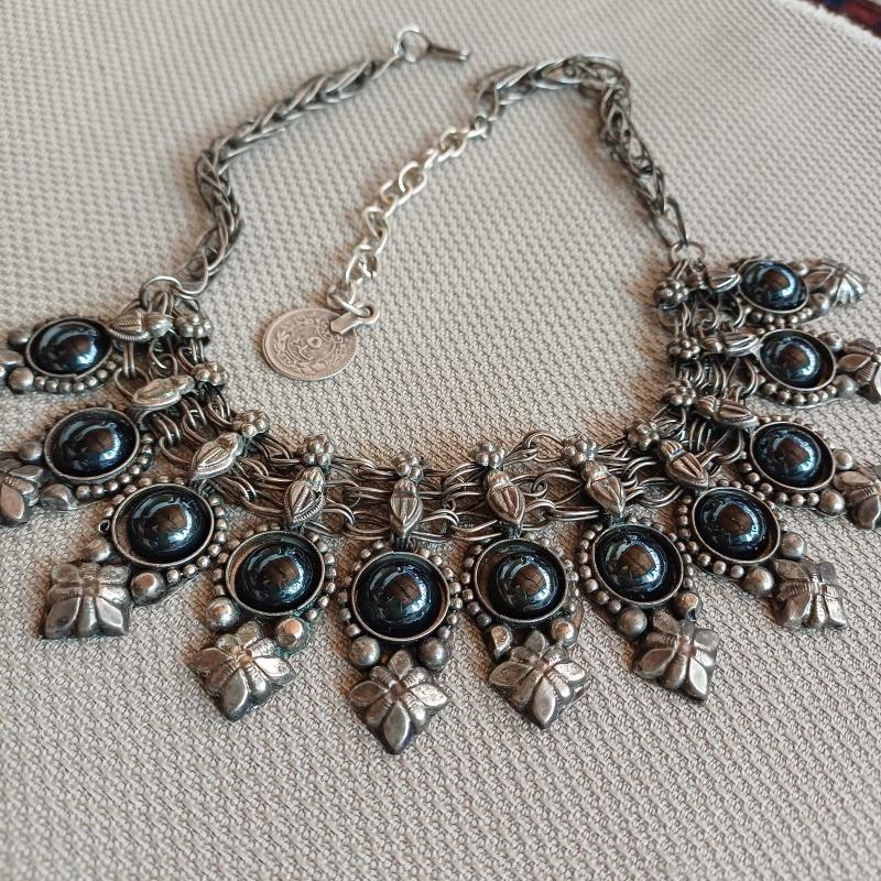 Dönemi ve menseini bilmediğim. Ancak harika bir el işi olduğunu hiç tereddütsüz söyleyebileceğim gerdanlık. Tek tek metal plakalar kesilip kivrilarak oluşturulmuş sarkıtlar ve onlara gömülü kabaşon hematitler ve yine teller kıvrılarak yapılmış bir zincir. Nadir bulunan bir parca oldugunu saniyorum. Arkasındaki zincire uzatma amaçlı eklediğim zincir orjinal değildir. Toplam uzunluk 48 cm Genişlik 4.5 cm