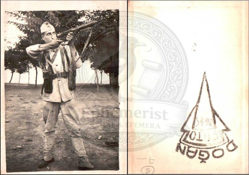 Elinde makineli tüfekle nişan vaziyetinde duran asker hatırası. Foto Doğan (Orijinal Fotoğraf, S/B, 1940'lar, 6x9 cm.), en son bir ay önce güncellenmiştir.