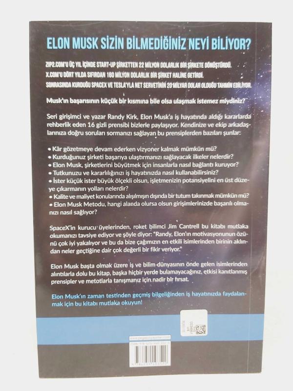 Elon Musk Metodu: Dünyanın En Güçlü Girişimcisini Zirveye Çıkaran İş Prensipleri - 1. BASKI, Randy Kirk tarafından kaleme alınmıştır. Kitap 2022 yılında PEGASUS YAYINLARI tarafından 9786254103520 ISBN kodu ile yayınlanmıştır. 191 sayfadır. Elon Musk Metodu: Dünyanın En Güçlü Girişimcisini Zirveye Çıkaran İş Prensipleri - 1. BASKI adlı eser Türkçe dilindedir.