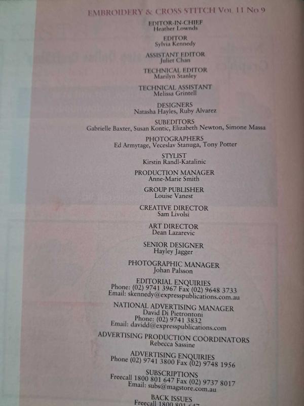 Kitap 2002 yılında [ABD] yayınlanmıştır. 82 sayfadır. Embroidery & Cross Stitch Vol:11 No:9 adlı eser İngilizce dilindedir.
