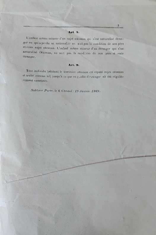 Kitap 1869 yılında yayınlanmıştır. 4 sayfadır. Empire Ottoman Loi sur la Nationalite Ottomane / Sublime Porte, le 6 Chewal 19 Januier 1869 [Osmanlı Vatandaşlık Kanunu] adlı eser Fransızca dilindedir.
