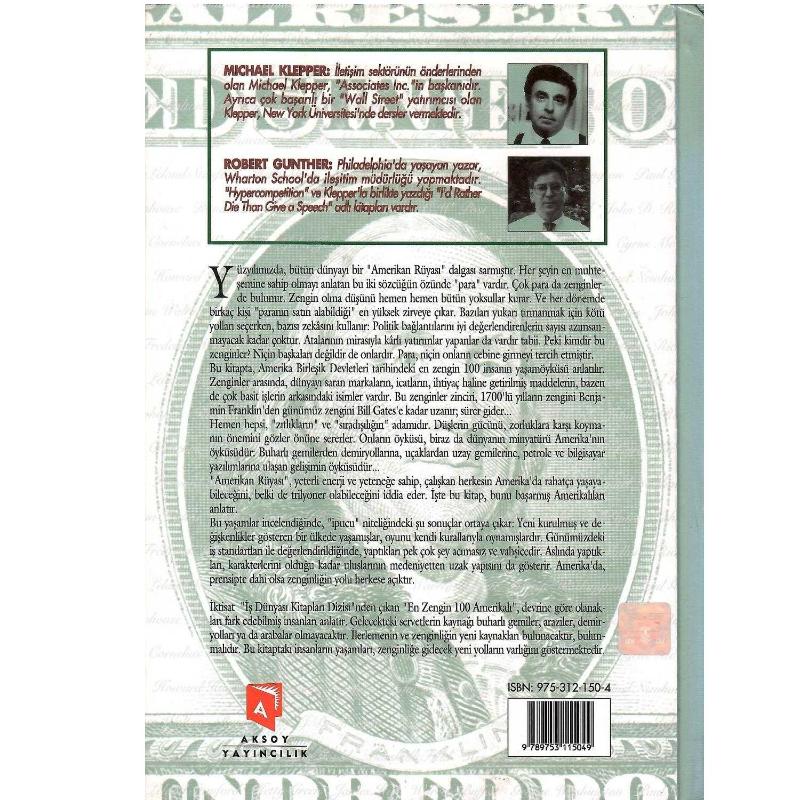 En Zengin 100 Amerikalı Benjamin Franklin'den Bill Gates'e En Zengin Amerikalılar (Ciltli Sert Kapak 1.Baskı), Michael Klepper - Robert Gunther tarafından kaleme alınmıştır. Kitap 1999 yılında Aksoy Yayıncılık tarafından [İstanbul] 9789753115049 ISBN kodu ile yayınlanmıştır. Satışta olan kitap, yayınevinin 1. baskısıdır. Bu baskının çevirisi Burcu Çekmece tarafından yapılmıştır. 360 sayfadır. En Zengin 100 Amerikalı Benjamin Franklin'den Bill Gates'e En Zengin Amerikalılar (Ciltli Sert Kapak 1.Baskı) adlı eser Türkçe dilindedir.