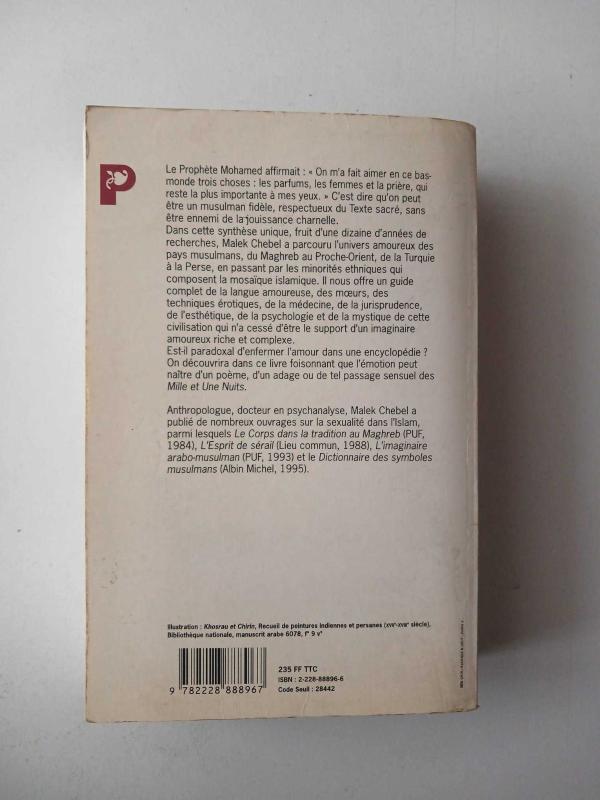 Encyclopédie de l'amour en Islam, Malek Chebel tarafından kaleme alınmıştır. Kitap 1995 yılında Payot tarafından yayınlanmıştır. 708 sayfadır. Encyclopédie de l'amour en Islam adlı eser Fransızca dilindedir.