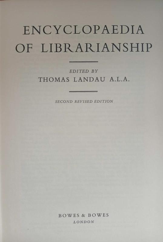 Encyclopedia of Librarianship, Thomas Landau tarafından kaleme alınmıştır. Kitap 1961 yılında Bowes & Bowes tarafından [London] yayınlanmıştır. Encyclopedia of Librarianship adlı eser İngilizce dilindedir.