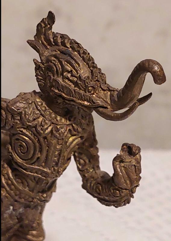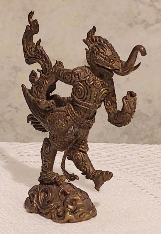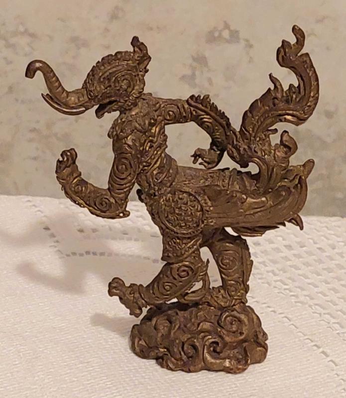 Endonezya, Phaya Khachasri Singhadetcha (Budist/Muska) Heykeli. "Kchasi, Himmapan Ormanından Gelen, Muazzam Bir Güce Sahip, Görkemli Fil, Aslan ve Anka Kuşu'nun Özelliklerini Bir Araya Getiren Efsanevi Bir Yaratıktır." Mükemmel Detaylı Bir İşçilik. Kaliteli Prinç-Bronz Döküm. 1950'ler. (25x70x90 mm) Nadir. başlıklı antika/koleksiyon objesi Asya menşe’lidir. 1940-1959 arası dönemine aittir.