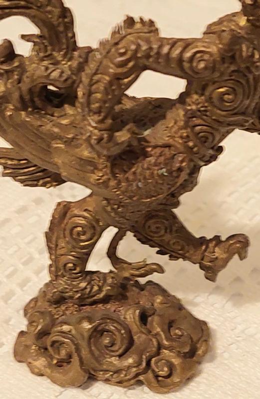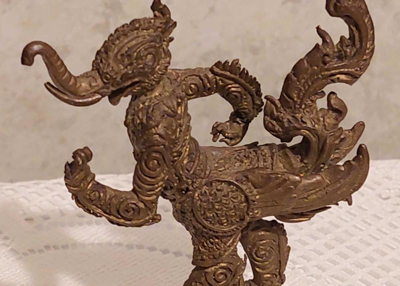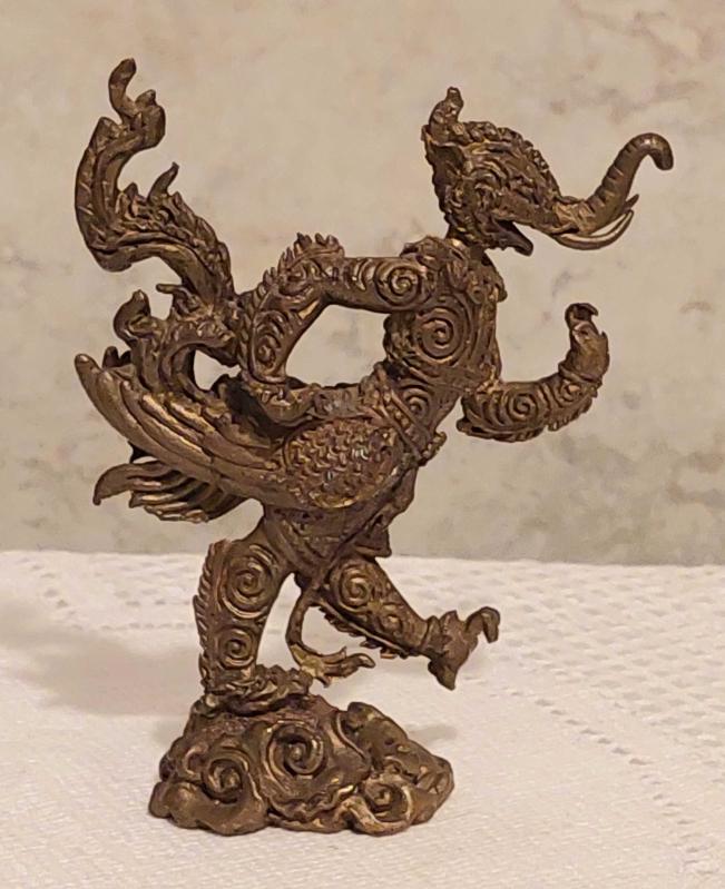 Endonezya, Phaya Khachasri Singhadetcha (Budist/Muska) Heykeli. "Kchasi, Himmapan Ormanından Gelen, Muazzam Bir Güce Sahip, Görkemli Fil, Aslan ve Anka Kuşu'nun Özelliklerini Bir Araya Getiren Efsanevi Bir Yaratıktır." Mükemmel Detaylı Bir İşçilik. Kaliteli Prinç-Bronz Döküm. 1950'ler. (25x70x90 mm) Nadir.