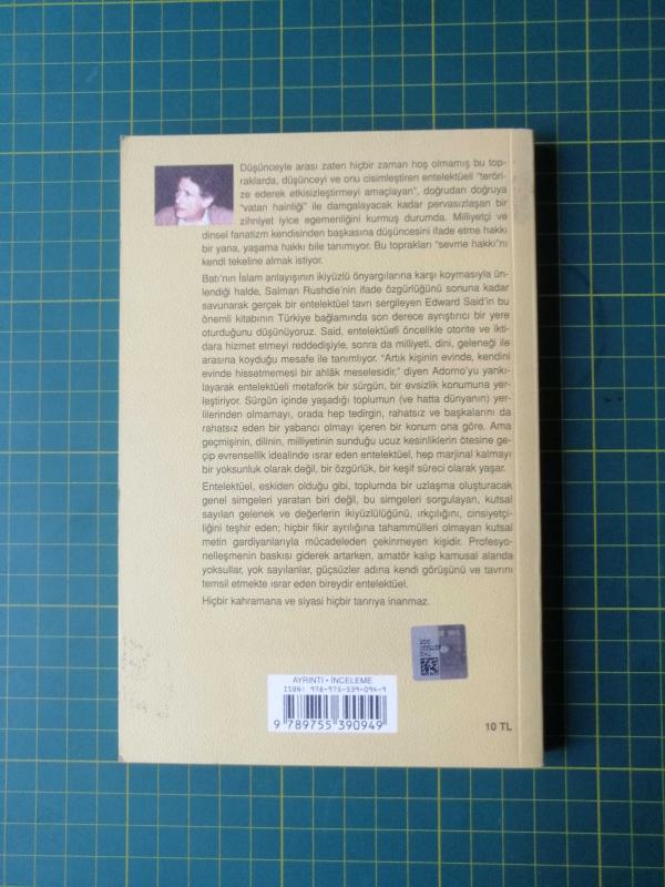 Entelektüel - Sürgün, Marjinal, Yabancı, Edward Said tarafından kaleme alınmıştır. Kitap 2017 yılında Ayrıntı Yayınları tarafından [İstanbul] 9789755390949 ISBN kodu ile yayınlanmıştır. 128 sayfadır. Entelektüel - Sürgün, Marjinal, Yabancı adlı eser Türkçe dilindedir.