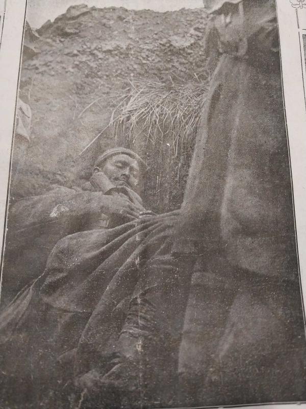Enver Paşa Galiçya Cephesi Harp Mecmuası Galiçya Cephesi Siper de El Bombası ile uyuyan Asker Görselli.Harp Mecmuası Yıl : 1. Sayı : Kasım 1916 Cepheden Pek çok fotoğraf ve Enver Paşa Fotoğraflı.