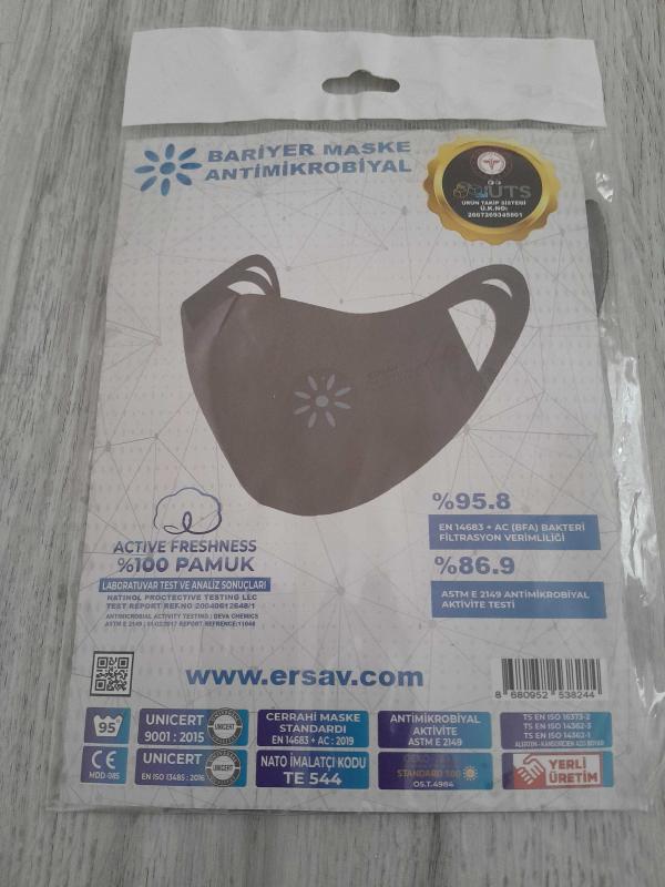 Ersav Antimikrobiyal Bariyer Maske, %100 Pamuk, Aktif Tazelik, Cerrahi Maske Standartlarına uygundur. Anti Mikrobiyal Aktivite teslerinden geçmiştir. 3 ISO Belgeli, UNICERT testlerinden geçmiştir. Kullanım Talimatları : Maskeyi, dikişi dışarıda olan kısmı burun kısmına denk gelecek şekilde yüzünüze takın. Burun Kısmı tam olarak oturacak şekilde ayarlayın. Çene kısmını düzeltin. Arka kulak bağlantılarını kulağınıza takın. Yıkama : İlk önce ellerinizi sterilize ediniz. 95 Derece yarım litre suyu kaba doldurun. Bu maskenin her yerine temas ettiğinden emin olun. Günlük olarak, sprey dezenfeksiyon ile dezenfekte edebilirsiniz.
