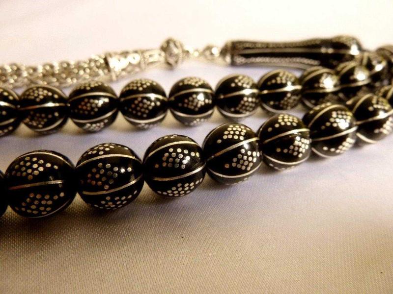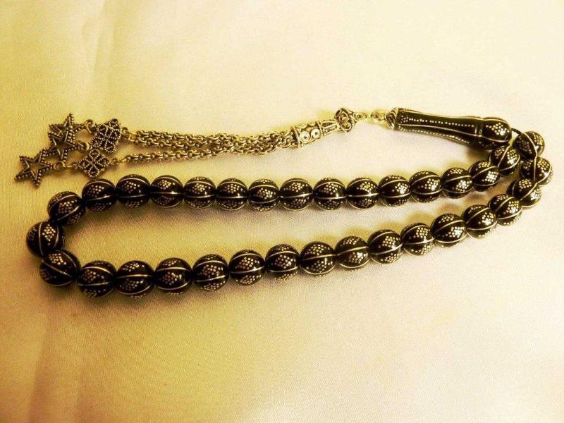 Erzurum oltu taşı, gümüş kakmalı, gümüş püsküllü, usta işi 33'lük tesbih. İmame dahil 23cm. Püskül dahil 36cm., en son 1 yıl önce güncellenmiştir.