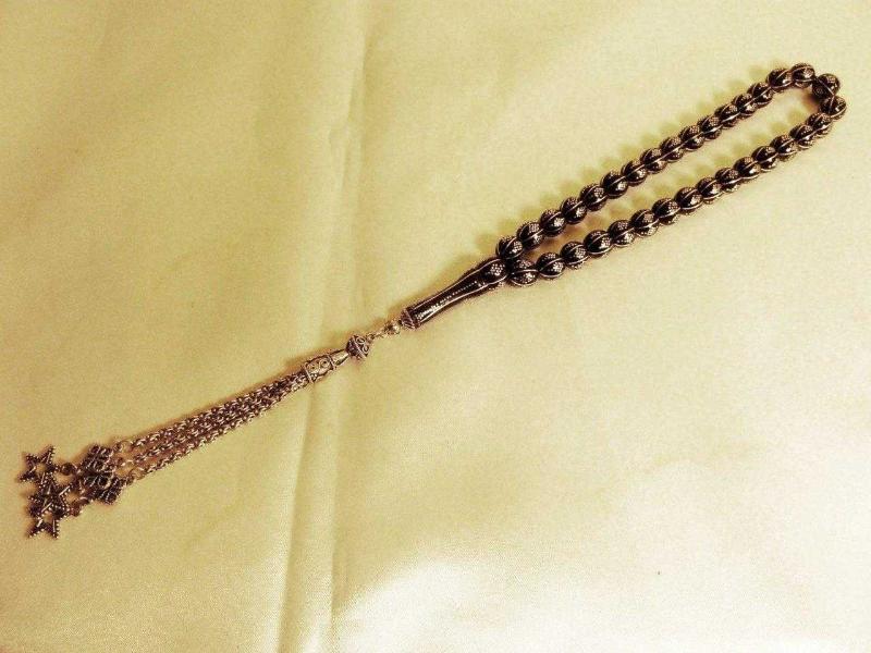 Erzurum oltu taşı, gümüş kakmalı, gümüş püsküllü, usta işi 33'lük tesbih. İmame dahil 23cm. Püskül dahil 36cm. başlıklı antika/koleksiyon objesinin menşei belirtilmemiştir. Objenin ait olduğu dönem bilinmeketedir.