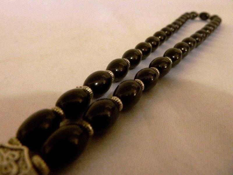 Erzurum oltu taşı, gümüş püsküllü, usta işi, 33'lük tesbih. İmame dahil 23cm. başlıklı antika/koleksiyon objesinin menşei belirtilmemiştir. Objenin ait olduğu dönem bilinmeketedir.