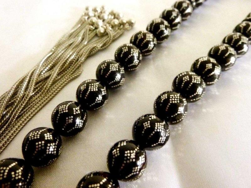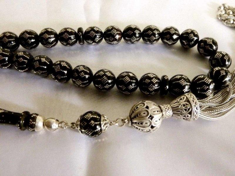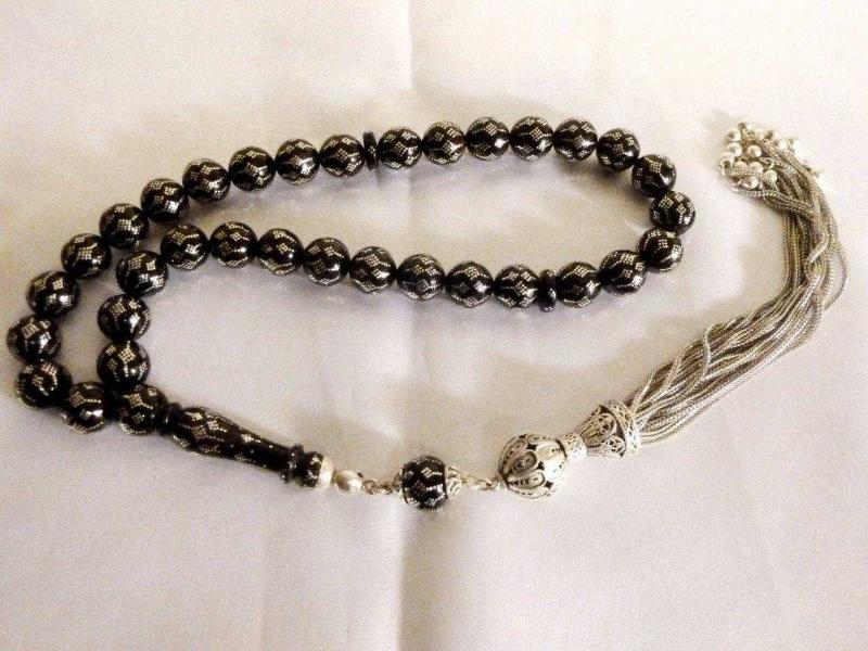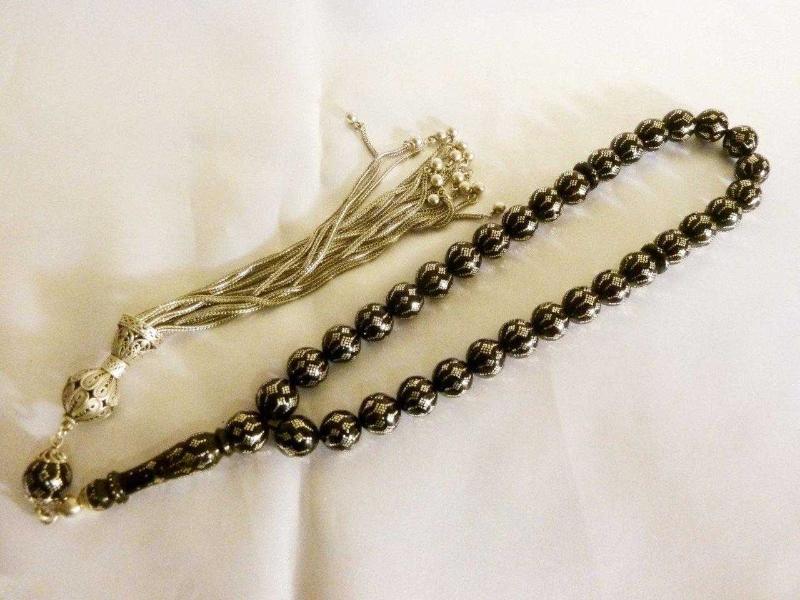 Erzurum oltu taşı, usta işi gümüş işlemeli, gümüş püsküllü 33'lük tesbih. Boy 47cm., en son 1 yıl önce güncellenmiştir.