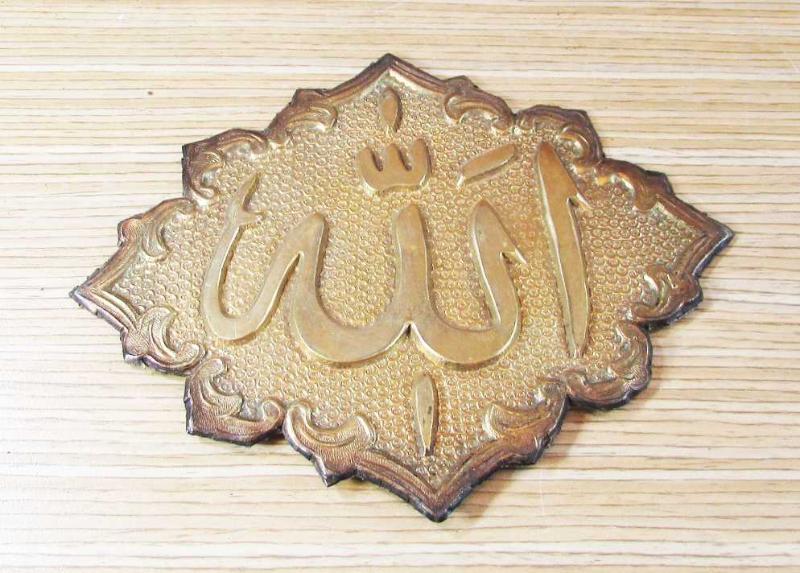 PİRİNÇ LEVHA ÜZERİNE GOFRE SANATLA KABARTMA OLARAK YAZILMIŞ, ALTIN VERMEYLENMİŞ ESKİ DİNİ LEVHA, SAĞLAM VE TEMİZ, YÜKSEKLİĞİ 10,5cm,GENİŞLİĞİ 14cm