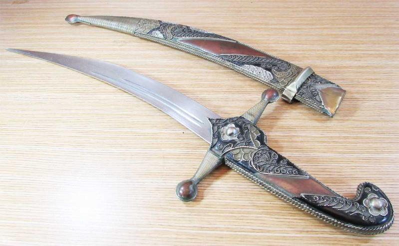 ESKİ DAĞİSTAN İŞİ ÇERKEZ KAMA, FARKLI FORM VE YAPIDA, ÇOK GÜZEL TELKARİ İŞLEMELİ BAKIR VE NİKEL KINLI, SAĞLAM,TERTEMİZ VE ÇOK İYİ KONDÜSYONDA, NAMLU KENARLARI AÇILMAMIŞ, KINLI UZUNLUĞU 50cm
