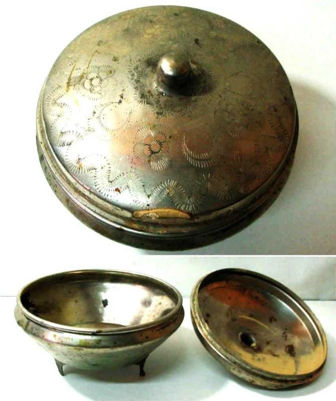 ESKİ NOSTALJİK BAKIR KAPAKLI ŞEKERLİK ÜZERİ NİKELAJ KAPLAMALI VE KALEM İŞLEMELİ BİRAZ TEMİZLENİRSE GÜZEL OLUR SAĞLAM YÜKSEKLİĞİ 10cm,ÜST GENİŞLİĞİ 14cm