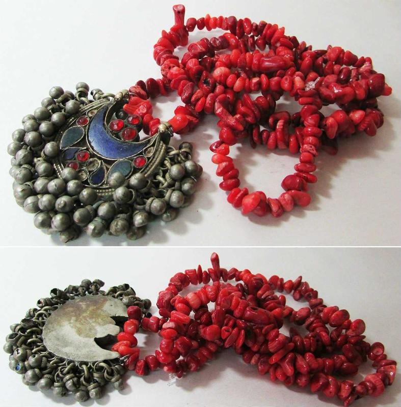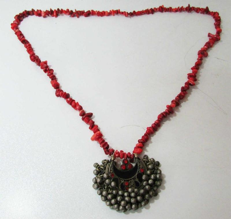 ESKİ OTANTİK BÜYÜK TÜRKMEN GERDANLIĞI UZUN BOYUN ASKISI TAMAMEN MERCAN DİZİSİDİR ALPAKA YAPILI,MİNELİ,TAŞ SÜSLEMELİ VE BOL CINGILLI SAĞLAM VE ÇOK İYİ KONDÜSYONDA UCUNUN CINGIILI GENİŞLİĞİ VE YÜKSEKLİĞİ 5cmx6,5cm MERCAN UZUNLUĞU 82cm