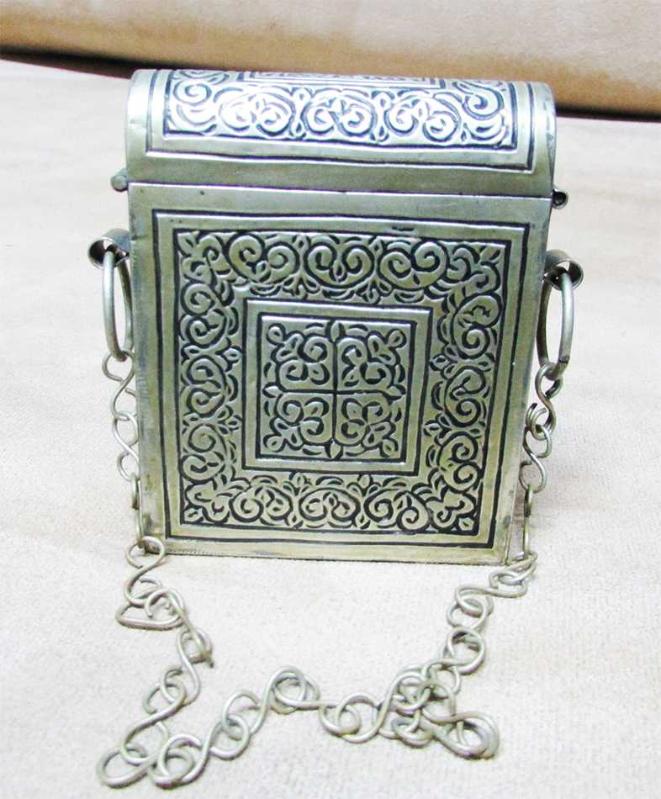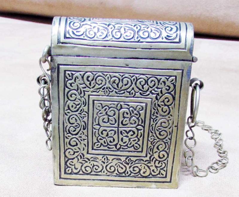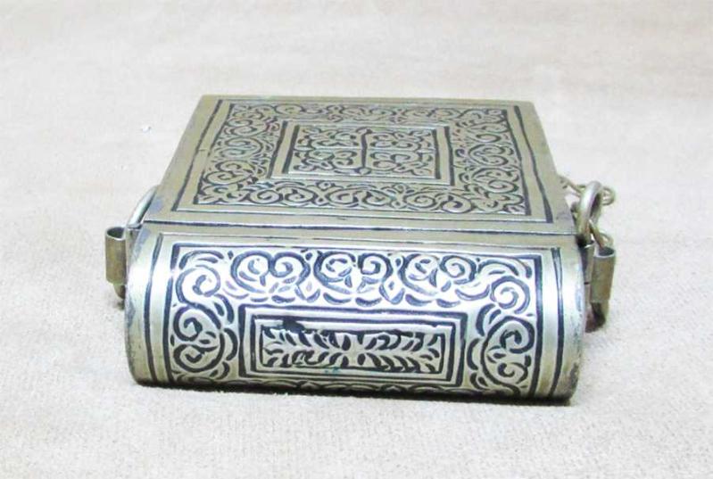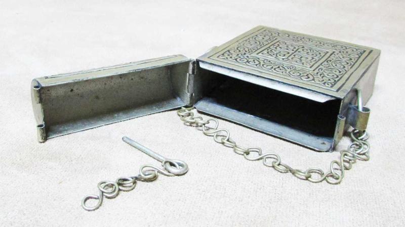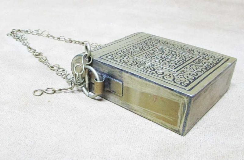 ESKİ, EN'AM VE KUR'AN MUHAFAZA KABI, DIŞ YÜZEYİ ÇOK GÜZEL İŞLEMELİ MOTİFLİ,KALIN PİRİNÇ METAL YAPILI KAPAĞI YANDAN AÇILIR,PİM KİLİTLİ, SAĞLAM VE TERTEMİZ, KALINLIĞI 2,5cm,GENİŞLİĞİ 7cm,YÜKSEKLİĞİ 9cm