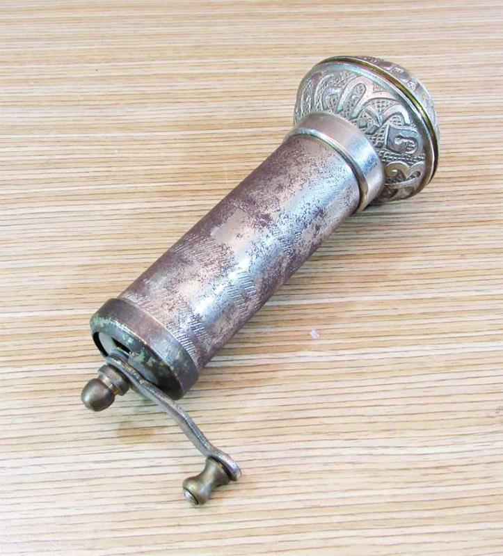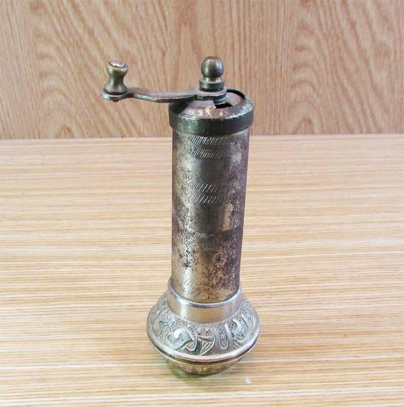 ESKİLERDEN ORTA BOY PİRİNÇ KAHVE-BAHARAT DEĞİRMENİ SAĞLAM VE GAYET İYİ KONDÜSYONDA HALİ İLE ÇALIŞIR VAZİYETTE GÖVDE GENİŞLİĞİ 3,5cm,GÖBEK GENİŞLİĞİ 5cm YÜKSEKLİĞİ 15cm