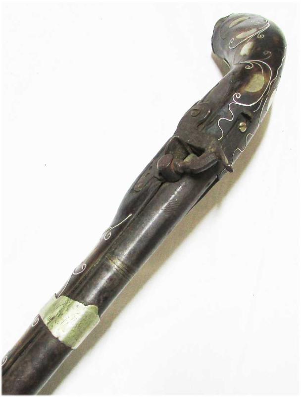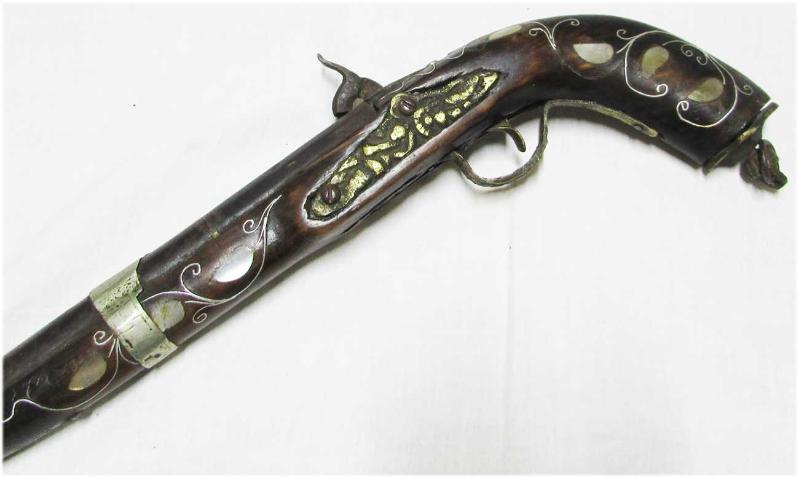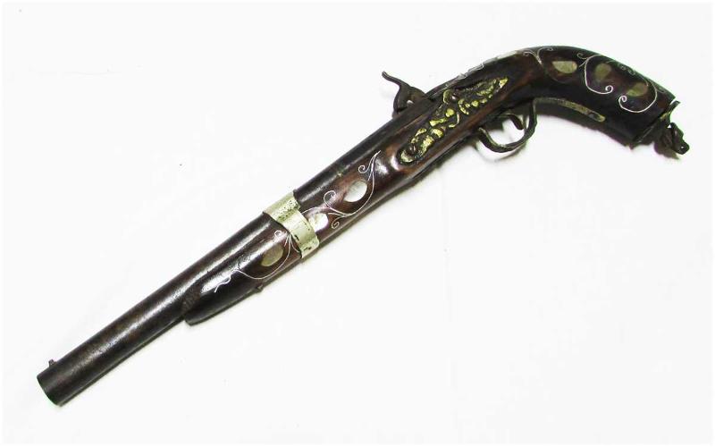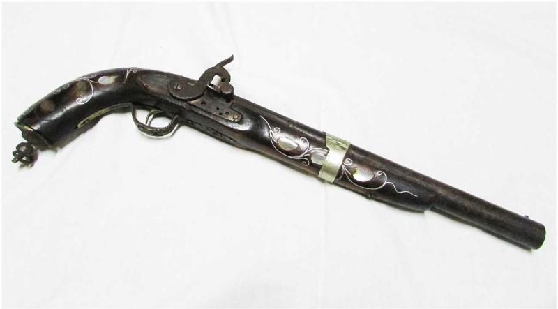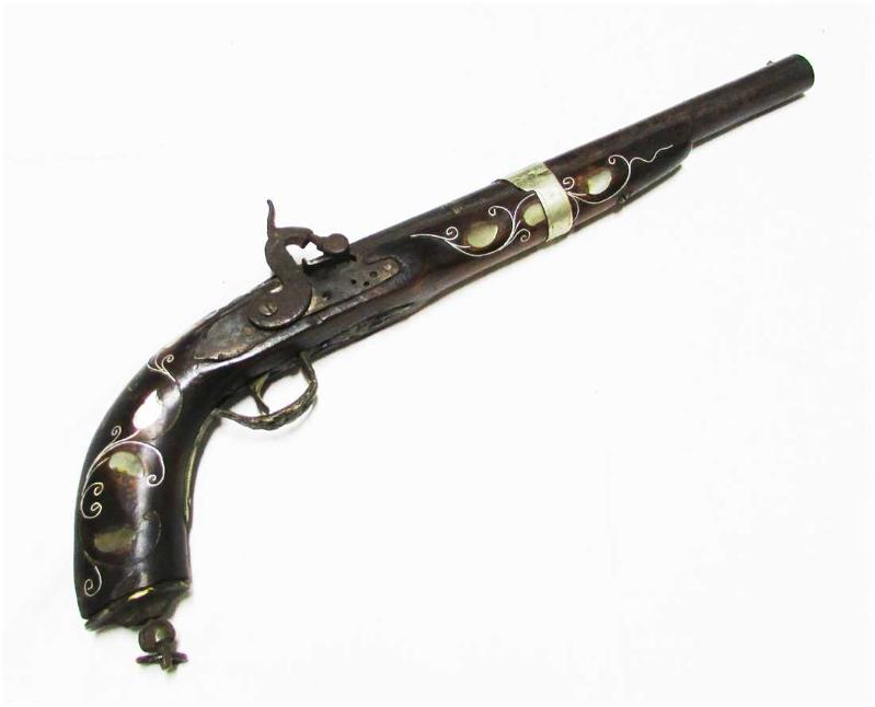 YENİ DEĞİL,OLDUKÇA ESKİLERDEN GÜZEL BİR ANTEP İŞÇİLİĞİ PİŞTOV, AHŞABI SEDEF,KEMİK VE TELKARİ SÜSLEME,DİPÇİK DİBİ PİRİNÇ KAPAMALI TETİK MEKANİZMA ÇALIŞIR VAZİYETTE, MEVCUDU İLE SAĞLAM VE ÇOK İYİ KONDÜSYONDA, UZUNLUĞU 45cm