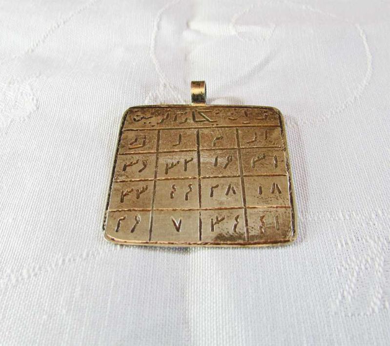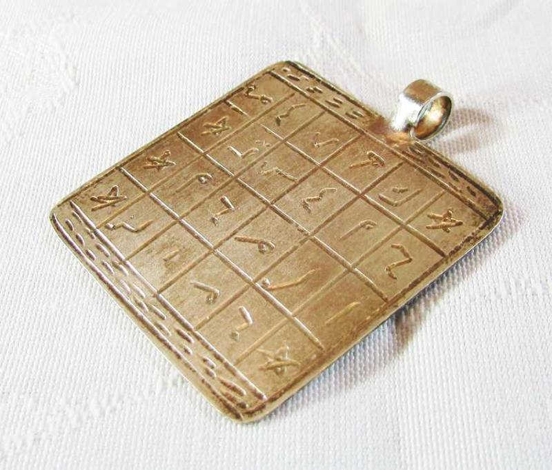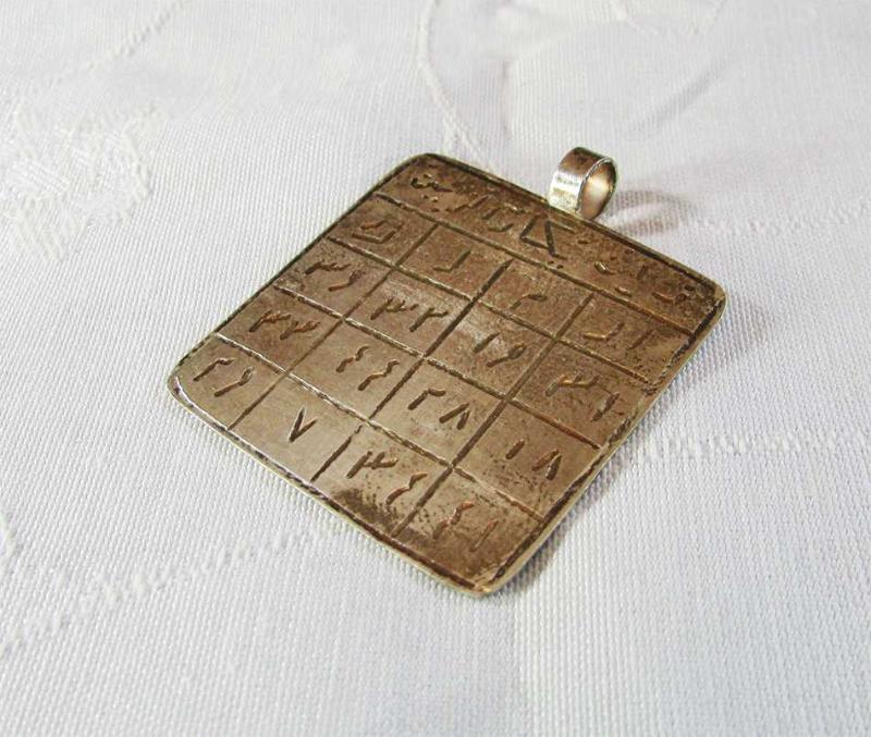 ESKİ, EL İŞÇİLİĞİ İLE YAPILIP,YİNE KALEM İŞÇİLİĞİ İLE ÇİFT TARAFLI OLARAK YAZILMIŞ, "ŞİFA BULMA VE HASTALIKLARDAN KORUNMA" İÇERİKLİ TILSIMLI BÜYÜK VEFK KOLYE UCU, 925 AYAR GÜMÜŞTÜR, GENİŞLİĞİ 34mm,YÜKSEKLİĞİ 40mm
