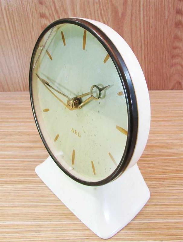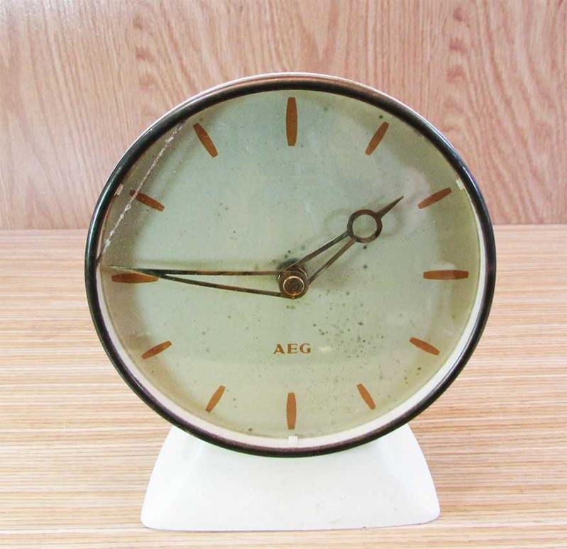 1960 LARDAN "AEG" MARKA ALMAN MALI ELEKTİRİKLİ,SERT PLASTİK KASALI MASA SAATİ GÖRÜLEN MEVCUDU İLE SAĞLAM VE İYİ DURUMDA CAMINDA GÖRÜLDÜĞÜ GİBİ ÇATLAK VAR FİŞİNİ PİRİZE TAKTIM,ÇALIŞMADI BİR ZARAR VERMEME AÇISINDAN,KURCALAMADIM BÜYÜK İHTİMALLE KABLO YADA FİŞTE SORUN VAR ÇÜNKÜ ELEKTİRİK GELDİĞİNİ GÖSTEREN LAMBASI YANMADI ALAN NASIL İSTERSE ÖYLE YAPSIN BEN BU HALİ İLE SATIYORUM KADRAN ÇAPI 14cm TABAN GENİŞLİĞİ 7,5cm,UZUNLUĞU 12cm KOMPLE YÜKSEKLİĞİ 17,5cm