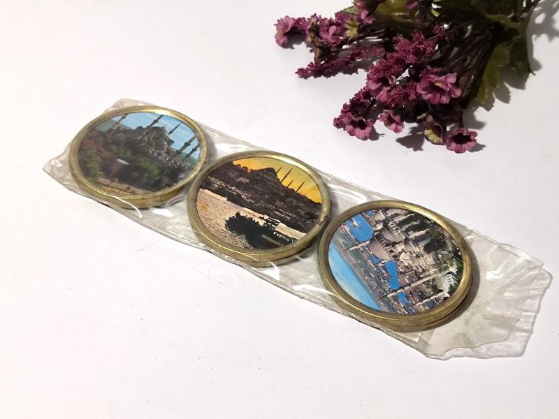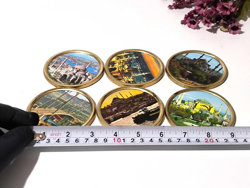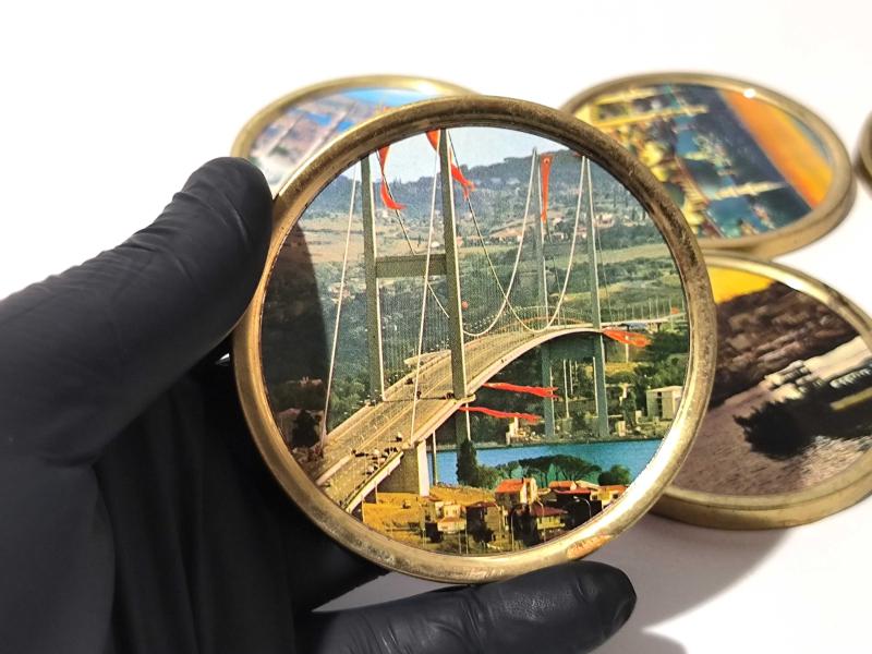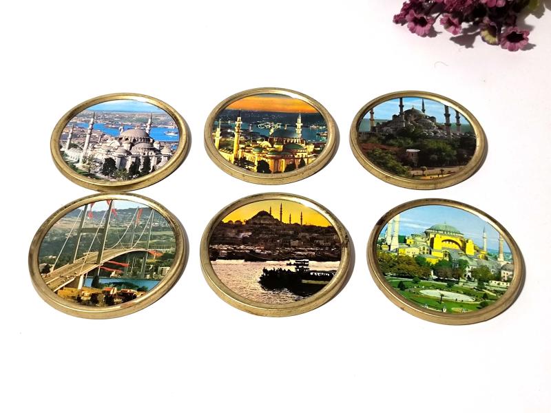 Eski Aya Sofya ve Süleymaniye Cami - Boğaz Köprüsü Mini Tabak - Dekor - Bardak Altı - İstanbul Temalı Hediyelik - 6 Adet başlıklı antika/koleksiyon objesinin menşei belirtilmemiştir. Objenin ait olduğu dönem bilinmeketedir.