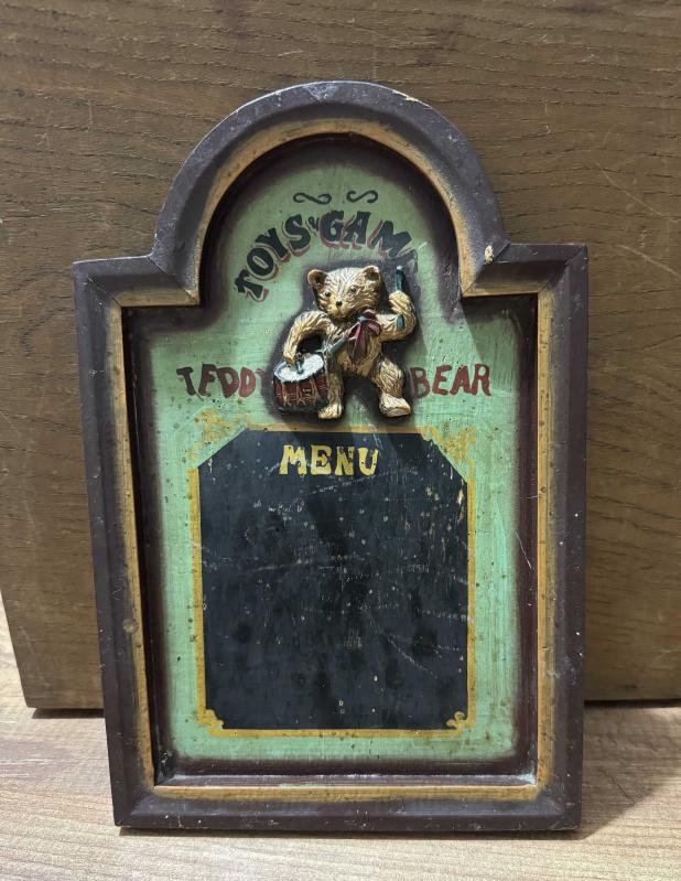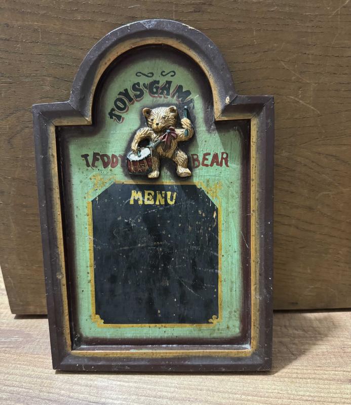 Eski Teddy Ayı Menü Tahtası 30 cm x 20 cm başlıklı antika/koleksiyon objesi Avrupa menşe’lidir. Objenin ait olduğu dönem bilinmeketedir.