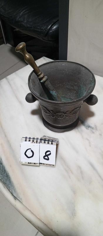 Nadir bulunan, özgün bir sanat eseri. Görseldeki havan seti, ağır pirinç/bronz alaşımdan özenle dökülmüştür. Dikkatli incelendiğinde, dönemin karakteristik motiflerini veya sanatsal izlerini taşıdığı görülmektedir (Lütfen bu kısmı havanın üzerindeki detaylara göre özelleştirin). Malzeme Kalitesi: Yüksek yoğunluklu döküm, otantik ağırlık ve sağlamlık sunar. Kondisyon: Yaşına göre mükemmel kondisyonda, sapı orijinal ve havan ile uyumludur. Yılların kattığı doğal oksitlenme (patina) temizlenmemiştir; bu da antika değerini korumaktadır. Bu eser, sadece bir obje değil, zamana direnen bir yatırımdır. (25 ymm 6000)