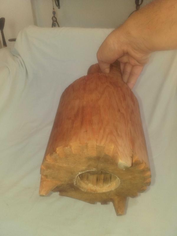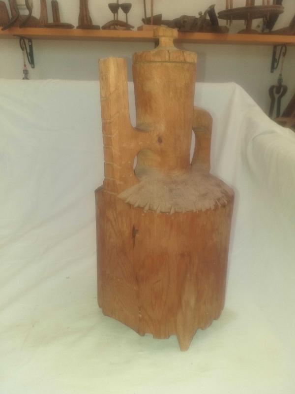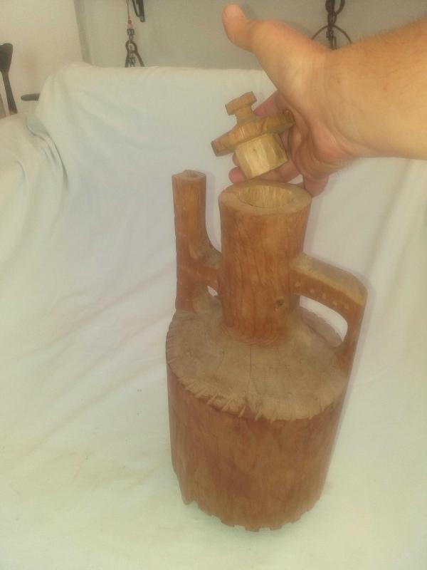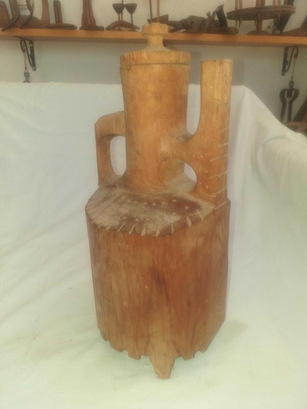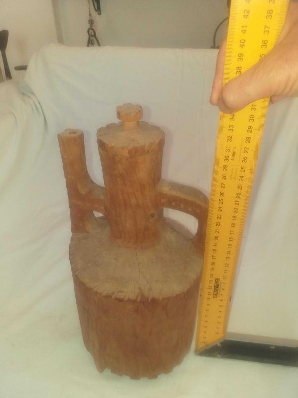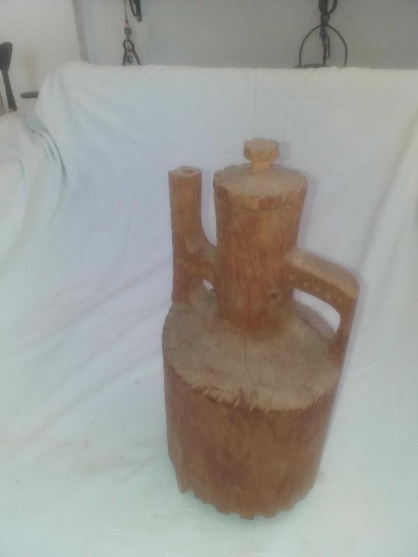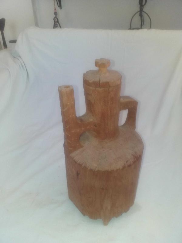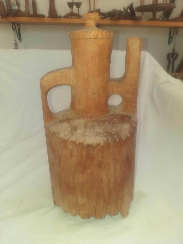 Yörük işi, muazzam patinesiyle güzel eskimiş ,ağacın içi keser benzeri aletlerle oyularak ,dibi düz bir ahşapla kapatılan, üç ayaklı , ahşap kapaklı , nadir formda, heykelvari detaylarla ve kertiklerle süslü ahşap ibrik... ''Eski çamlar bardak oldu'' atasözündeki bardak, çam ağacından oyulma... Tek kulplu , son derece dekoratif obje, dönem termosu... Mutfak aleti , ethnografik sanat , ethnografic art , reprodüksiyon, reproduction, folk art...