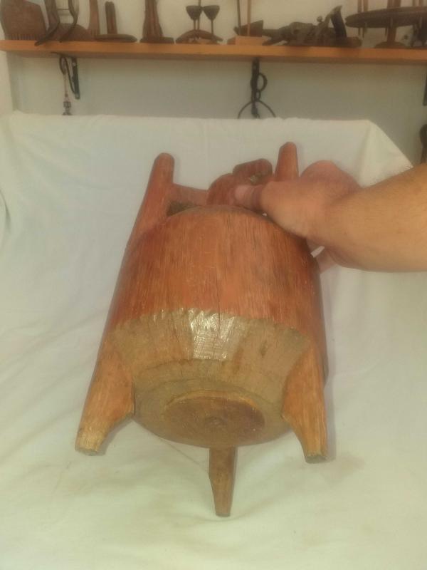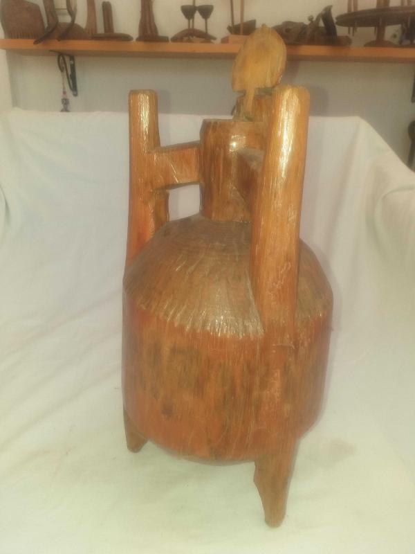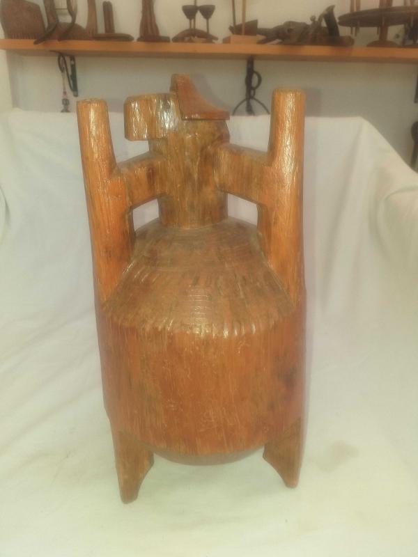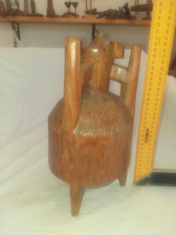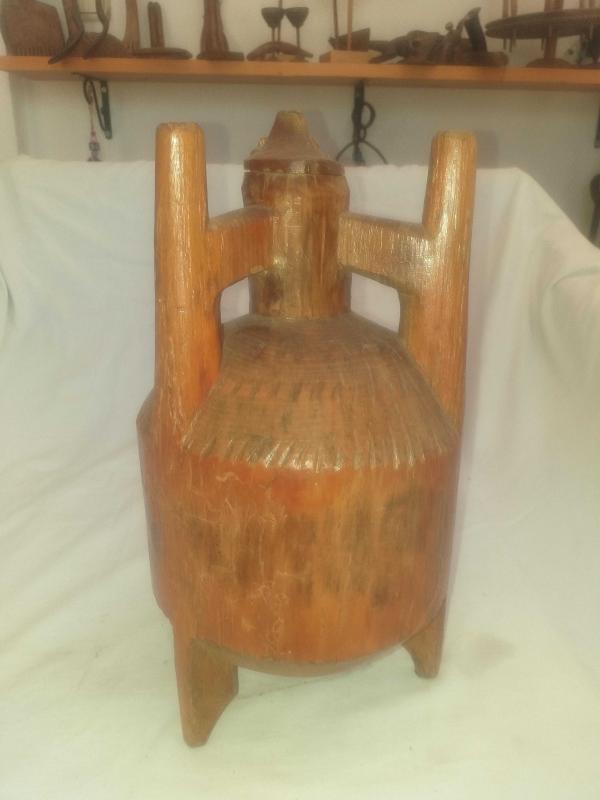 Yörük işi, muazzam patinesiyle güzel eskimiş ,ağacın içi keser benzeri aletlerle oyularak ,dibi düz bir ahşapla kapatılan, üç ayaklı , ahşap kapaklı , nadir formda, heykelvari detaylarla ve kertiklerle süslü ahşap testi... ''Eski çamlar bardak oldu'' atasözündeki bardak , üç kulplu , son derece dekoratif, çam ağacından oyma obje... Mutfak aleti , ethnografik sanat , ethnografic art , reprodüksiyon, reproduction, folk art...