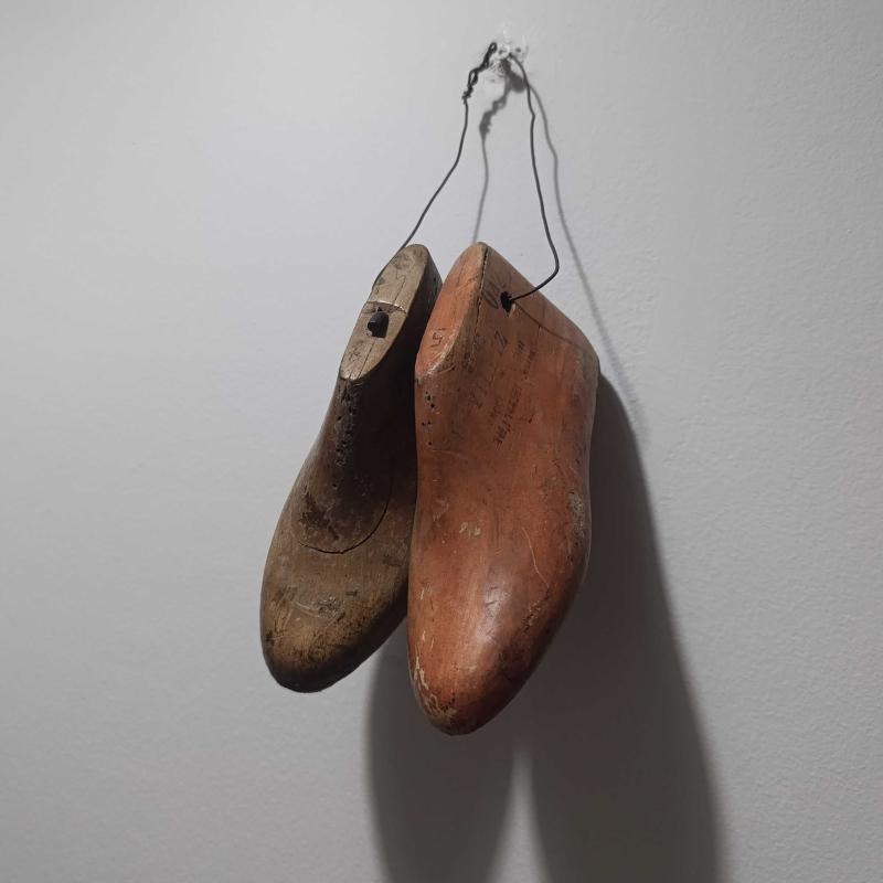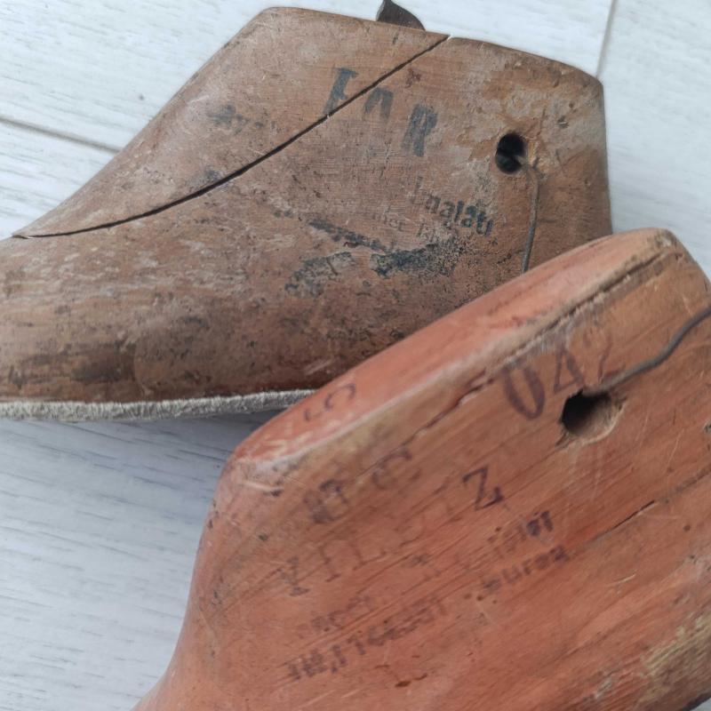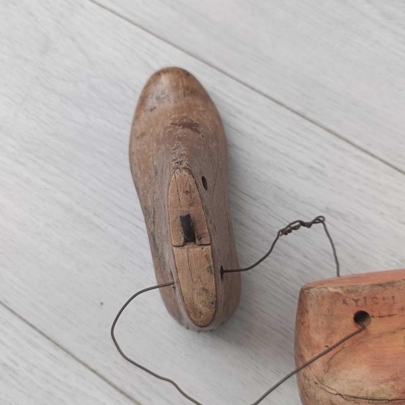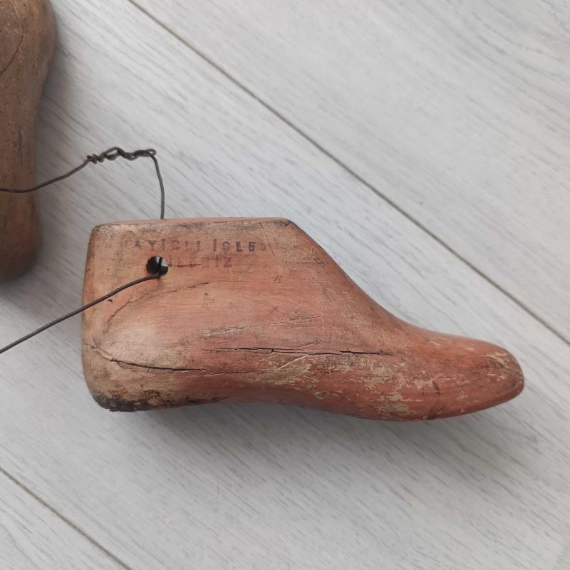 Eski dönem, 2 farklı ahşap ayakkabıcı kalıbı. Kalıpların boyutları 16 cm ve 17 cm olup, her birinde farklı imalatçı kaşesi bulunmaktadır.