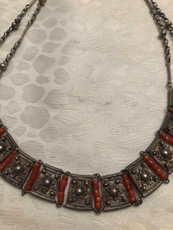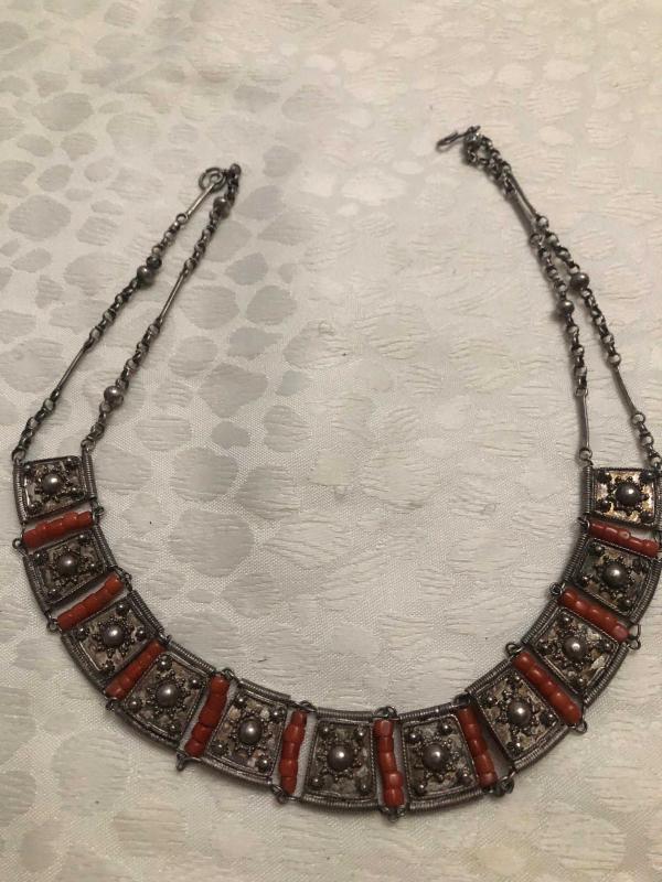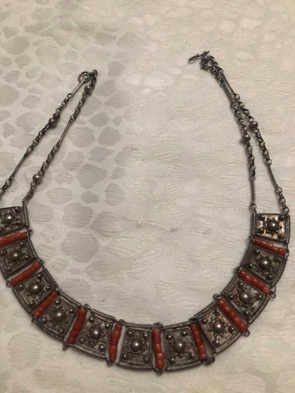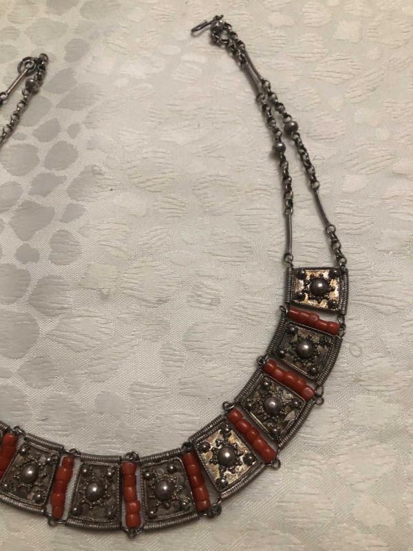 Eski gümüş mercan işlemeli kolye başlıklı antika/koleksiyon objesi Türkiye menşe’lidir. 1920-1940 arası dönemine aittir.