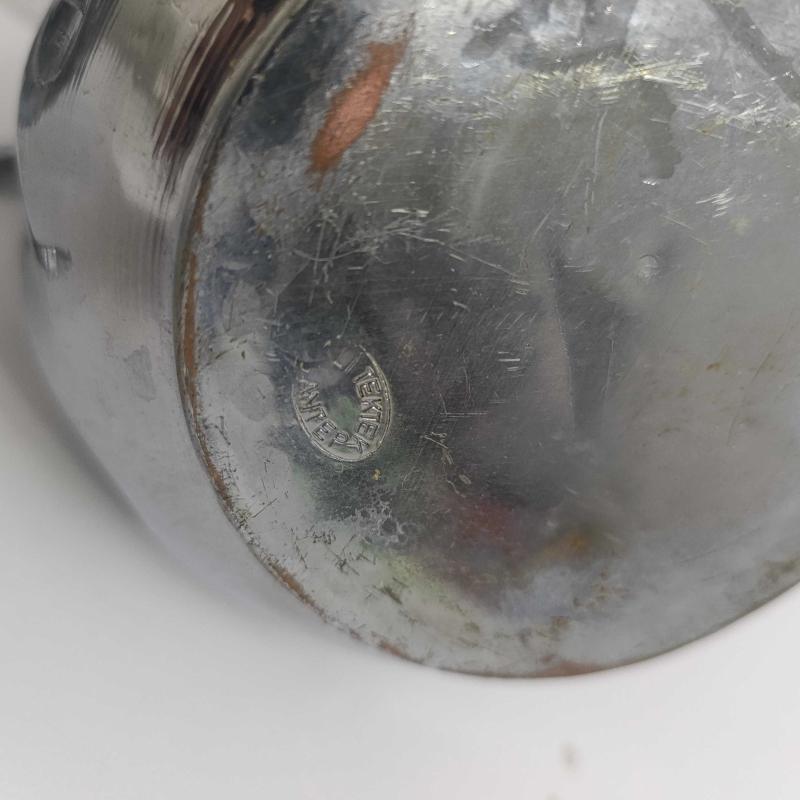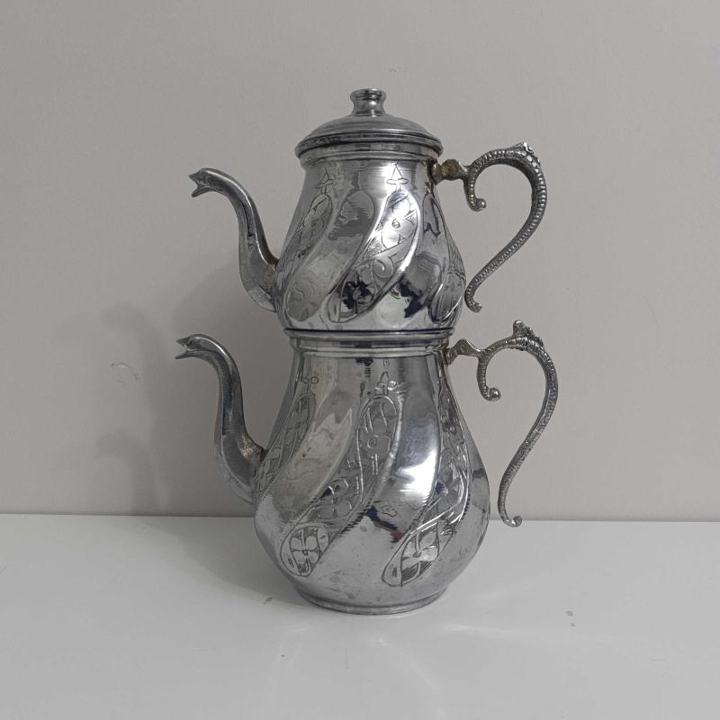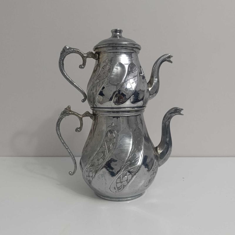 Eski bakır üzeri kalay kaplamalı çaydanlık. Üzeri kalem işleme desenli, ördek ağızlı modeldir. Çok temiz durumdadır. Boyu 31 cm’dir. Ortalama Üst demlik 1 litre, alt demlik 2 litre